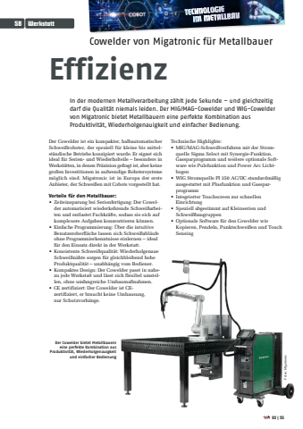 58Werkstatt03|25Cowelder von Migatronic f%u00fcr MetallbauerEffizienzIn der modernen Metallverarbeitung z%u00e4hlt jede Sekunde %u2013 und gleichzeitig darf die Qualit%u00e4t niemals leiden. Der MIG/MAG-Cowelder und WIG-Cowelder von Migatronic bietet Metallbauern eine perfekte Kombination aus Produktivit%u00e4t, Wiederholgenauigkeit und einfacher Bedienung.Der Cowelder ist ein kompakter, halbautomatischer Schwei%u00dfroboter, der speziell f%u00fcr kleine bis mittelst%u00e4ndische Betriebe konzipiert wurde. Er eignet sich ideal f%u00fcr Serien- und Wiederholteile %u2013 besonders in Werkst%u00e4tten, in denen Pr%u00e4zision gefragt ist, aber keine gro%u00dfen Investitionen in aufwendige Robotersysteme m%u00f6glich sind. Migatronic ist in Europa der erste Anbieter, der Schwei%u00dfen mit Cobots vorgestellt hat.Vorteile f%u00fcr den Metallbauer:%u2022Zeiteinsparung bei Serienfertigung: Der Cowelder automatisiert wiederkehrende Schwei%u00dfarbeiten und entlastet Fachkr%u00e4fte, sodass sie sich auf komplexere Aufgaben konzentrieren k%u00f6nnen.%u2022Einfache Programmierung: %u00dcber die intuitive Benutzeroberfl%u00e4che lassen sich Schwei%u00dfabl%u00e4ufe ohne Programmierkenntnisse einlernen %u2013 ideal f%u00fcr den Einsatz direkt in der Werkstatt.%u2022Konsistente Schwei%u00dfqualit%u00e4t: Wiederholgenaue Schwei%u00dfn%u00e4hte sorgen f%u00fcr gleichbleibend hohe Produktqualit%u00e4t %u2013 unabh%u00e4ngig vom Bediener.%u2022Kompaktes Design: Der Cowelder passt in nahezu jede Werkstatt und l%u00e4sst sich flexibel umstellen, ohne umfangreiche Umbauma%u00dfnahmen.%u2022CE zertifiziert: Der Cowelder ist CEzertifiziert, er braucht keine Umhausung, nur Schutzvorh%u00e4nge.Technische Highlights:%u2022MIG/MAG-Schwei%u00dfverfahren mit der Stromquelle Sigma Select mit Synergie-Funktion, Gassparprogramm und weitere optionale Software wie Pulsfunktion und Power Arc Lichtbogen%u2022WIG Stromquelle PI 350 AC/DC standardm%u00e4%u00dfig ausgestattet mit Plusfunktion und Gassparprogramm%u2022Integrierter Touchscreen zur schnellen Einrichtung%u2022Speziell abgestimmt auf Kleinserien und Schwei%u00dfbaugruppen%u2022Optionale Software f%u00fcr den Cowelder wie Kopieren, Pendeln, Punktschwei%u00dfen und Touch SensingFotos: MigatronicDer Cowelder bietet Metallbauern eine perfekte Kombination aus Produktivit%u00e4t, Wiederholgenauigkeit und einfacher Bedienung