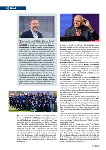 Auch in diesem Jahr nahmen %u00fcber 90 Mitarbeitende von GEZE beim Ditzinger Lebenslauf teil, der sowohl in Pr%u00e4senz als auch in einer hybriden Form stattfand. Seit 26 Jahren laufen bei dieser Gelegenheit jedes Jahr hunderte Menschen f%u00fcr einen guten Zweck. Die Mitarbeitenden des Leonberger Unternehmens sind seit %u00fcber 15 Jahren mit am Start und sammelten auch in diesem Jahr etliche Kilometer und damit Geld f%u00fcr den Kampf gegen Mukoviszidose. Die Teilnahme ist f%u00fcr das Familienunternehmen jedes Jahr eine Selbstverst%u00e4ndlichkeit. Insgesamt erliefen die Mitarbeitenden in diesem Jahr 4000 Euro. yFoto: W%u00fcrth Am 29. April 2025 feierte das Familienunternehmen W%u00fcrth den 90. Geburtstag von Professor Reinhold W%u00fcrth sowie das 80-j%u00e4hrige Bestehen der W%u00fcrth-Gruppe. Familie und Wegbegleiter, G%u00e4ste aus Politik, Wirtschaft und Kultur, Kunden und Lieferanten sowie die Unternehmensleitung w%u00fcrdigten seine Lebensleistung bei einem Festakt im Carmen W%u00fcrth Forum in K%u00fcnzelsau.Benjamin W%u00fcrth, Vorsitzender des Stiftungsaufsichtsrats der W%u00fcrth-Gruppe, Robert Friedmann, Sprecher der Konzernf%u00fchrung der W%u00fcrth-Gruppe, und Norbert Heckmann, Mitglied der Konzernf%u00fchrung der W%u00fcrth-Gruppe sowie Sprecher der Gesch%u00e4ftsf%u00fchrung der Adolf W%u00fcrth GmbH & Co. KG, begr%u00fc%u00dften die rund 500 G%u00e4ste.In einer Videogru%u00dfbotschaft gratulierte Frank-Walter Steinmeier, Bundespr%u00e4sident der Bundesrepublik Deutschland, zum doppelten Jubil%u00e4um: %u201eSie feiern heute ein doppeltes Jubil%u00e4um, das weit %u00fcber K%u00fcnzelsau, Hohenlohe und Heilbronn-Franken hinausleuchtet. Sie, lieber Herr W%u00fcrth, und Ihr Unternehmen haben nicht nur Ihre Heimatregion gepr%u00e4gt, Sie haben auch an der Erfolgsgeschichte der Bundesrepublik mitgeschrieben.%u201c Die Festrede im Carmen W%u00fcrth Forum hielt der baden-w%u00fcrttembergische Ministerpr%u00e4sident Winfried Kretschmann: %u201eReinhold W%u00fcrth ist ein badenw%u00fcrttembergischer Unternehmer par excellence, der Chancen sieht und umsetzt. Sein Lebenswerk zeigt, dass Wandel m%u00f6glich ist und dass man auch aus schwierigen Ausgangslagen heraus Gro%u00dfes schaffen kann.%u201c%u201e90 Jahre Leben sind eine nicht gew%u00f6hnliche Lebenszeit. Ich bin deshalb sehr dankbar, dass ich auf ein Leben zur%u00fcckblicken kann, in dem ich einiges bewegen konnte%u201c, schaute Professor W%u00fcrth in seiner Ansprache zur%u00fcck. Anl%u00e4sslich des 90. Geburtstags von Prof. W%u00fcrth wird von der Familie W%u00fcrth sowie der gesamten W%u00fcrth-Gruppe ein Arboretum beim Carmen W%u00fcrth Forum angelegt, das sich %u00fcber die Jahre hinweg %u00fcber den ganzen Campus weiterentwickeln wird. Die gepflanzten B%u00e4ume stehen f%u00fcr die Werte, f%u00fcr die Prof. W%u00fcrth und sein Unternehmen stehen: Best%u00e4ndigkeit und St%u00e4rke, Vielfalt und Anpassungsf%u00e4higkeit sowie Wachstum und Weitsicht. y Am 2. April wurde Diether Hils von der Mitgliederversammlung des Bundesverbands Metall (BVM) in Magdeburg zum neuen Hauptgesch%u00e4ftsf%u00fchrer gew%u00e4hlt. Diether Hils ist DiplomIngenieur und im Verb%u00e4ndewesen sehr gut vernetzt. Er ist seit 2009 als Bereichsleiter f%u00fcr die Berufliche Bildung im Metallhandwerk und als Gesch%u00e4ftsf%u00fchrer des Bildungswerks Metall f%u00fcr das Bundesfachzentrum Metall sowie f%u00fcr das Zentrum f%u00fcr Aufzugstechnik verantwortlich %u2013 zwei bundesweit ausgerichtete Fachzentren f%u00fcr Aus- und Weiterbildung im Metallhandwerk.%u201eWir freuen uns auf die k%u00fcnftige Zusammenarbeit mit Diether Hils, den wir seit Jahren kennen und sch%u00e4tzen. Mit seiner umfangreichen Erfahrung und seinem Verst%u00e4ndnis f%u00fcr die Herausforderungen im Metallhandwerk wird er den Verband erfolgreich in die Zukunft f%u00fchren%u201c, erkl%u00e4rte BVM-Pr%u00e4sident Willi Seiger. Markus J%u00e4ger, der bisherige Hauptgesch%u00e4ftsf%u00fchrer, hat den Verband nach sechs Jahren verlassen. yFoto: BVMFoto: GEZE6Aktuell03|25