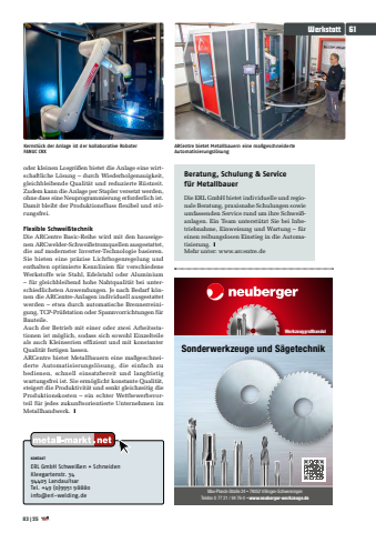 KONTAKTERL GmbH Schwei%u00dfen + SchneidenKleegartenstr. 3494405 Landau/IsarTel. +49 (0)9951 98880info@erl-welding.deWerkstatt6103|25Beratung, Schulung & Service f%u00fcr MetallbauerDie ERL GmbH bietet individuelle und regionale Beratung, praxisnahe Schulungen sowie umfassenden Service rund um ihre Schwei%u00dfanlagen. Ein Team unterst%u00fctzt Sie bei Inbetriebnahme, Einweisung und Wartung %u2013 f%u00fcr einen reibungslosen Einstieg in die Automatisierung. yMehr unter: www.arcentre.deoder kleinen Losgr%u00f6%u00dfen bietet die Anlage eine wirtschaftliche L%u00f6sung %u2013 durch Wiederholgenauigkeit, gleichbleibende Qualit%u00e4t und reduzierte R%u00fcstzeit. Zudem kann die Anlage per Stapler versetzt werden, ohne dass eine Neuprogrammierung erforderlich ist. Damit bleibt der Produktionsfluss flexibel und st%u00f6rungsfrei. Flexible Schwei%u00dftechnikDie ARCentre Basic-Reihe wird mit den hauseigenen ARCwelder-Schwei%u00dfstromquellen ausgestattet, die auf modernster Inverter-Technologie basieren. Sie bieten eine pr%u00e4zise Lichtbogenregelung und enthalten optimierte Kennlinien f%u00fcr verschiedene Werkstoffe wie Stahl, Edelstahl oder Aluminium %u2013 f%u00fcr gleichbleibend hohe Nahtqualit%u00e4t bei unterschiedlichsten Anwendungen. Je nach Bedarf k%u00f6nnen die ARCentre-Anlagen individuell ausgestattet werden %u2013 etwa durch automatische Brennerreinigung, TCP-Pr%u00fcfstation oder Spannvorrichtungen f%u00fcr Bauteile. Auch der Betrieb mit einer oder zwei Arbeitsstationen ist m%u00f6glich, sodass sich sowohl Einzelteile als auch Kleinserien effizient und mit konstanter Qualit%u00e4t fertigen lassen. ARCentre bietet Metallbauern eine ma%u00dfgeschneiderte Automatisierungsl%u00f6sung, die einfach zu bedienen, schnell einsatzbereit und langfristig wartungsfrei ist. Sie erm%u00f6glicht konstante Qualit%u00e4t, steigert die Produktivit%u00e4t und senkt gleichzeitig die Produktionskosten %u2013 ein echter Wettbewerbsvorteil f%u00fcr jedes zukunftsorientierte Unternehmen im Metallhandwerk. yKernst%u00fcck der Anlage ist der kollaborative Roboter FANUC CRXARCentre bietet Metallbauern eine ma%u00dfgeschneiderte Automatisierungsl%u00f6sungSonderwerkzeuge und S%u00e4getechnikMax-Planck-Stra%u00dfe 24 %u2022 78052 Villingen-SchwenningenTelefon 0 77 21 / 94 76-0 %u2022 www.neuberger-werkzeuge.deWerkzeuggro%u00dfhandel