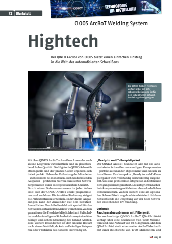 72Werkstatt03|25CLOOS ArcBoT Welding SystemHightechDer QINEO ArcBoT von CLOOS bietet einen einfachen Einstieg in die Welt des automatisierten Schwei%u00dfens.Mit dem QINEO ArcBoT schwei%u00dfen Anwender auch kleine Losgr%u00f6%u00dfen wirtschaftlich und in gleichbleibend hoher Qualit%u00e4t. Die Hightech-QINEO-Schwei%u00dfstromquelle und der pr%u00e4zise Cobot erg%u00e4nzen sich dabei perfekt. Neben der Entlastung der Mitarbeiter %u2013 insbesondere bei monotonen, sich wiederholenden Aufgaben %u2013 profitieren Sie von exzellenten Schwei%u00dfergebnissen durch die reproduzierbare Qualit%u00e4t. Durch einen Drehmomentsensor in jeder Achse l%u00e4sst sich der QINEO ArcBoT exakt programmieren und verfahren. Die intuitive Bedienung steigert die Arbeitseffizienz erheblich. Individuelle Anpassungen kann der Anwender auf dem benutzerfreundlichen Touch-Bedienfeld mit speziell f%u00fcr das Schwei%u00dfen entwickelten Makros vornehmen. Zudem garantieren die Freedrive-M%u00f6glichkeit mit Fu%u00dfschalter und das intelligente Sicherheitskonzept eine feinf%u00fchlige und sichere Steuerung des QINEO ArcBoT. Eine weitere Besonderheit ist der einfache Restart nach einem Not-Halt, da kein aufw%u00e4ndiges Entsperren oder Freifahren des Roboters notwendig ist.%u201eReady to weld%u201c-KomplettpaketDer QINEO ArcBoT beinhaltet alle f%u00fcr das automatisierte Schwei%u00dfen notwendigen Komponenten %u2013 perfekt aufeinander abgestimmt und einfach zu installieren. Das kompakte %u201eReady to weld%u201c-Komplettpaket wird vollst%u00e4ndig schwei%u00dffertig ausgeliefert, was eine problemlose Integration in bestehende Fertigungsabl%u00e4ufe garantiert. Die integrierten Sicherheitskomponenten gew%u00e4hrleisten den erforderlichen Personenschutz. Zudem sichert eine am optionalen Schwei%u00dftisch angebrachte elektrisch fahrbare Schutzblende die Umgebung vor der beim Schwei%u00dfen entstehenden UV-Strahlung.Optional: Rauchgasabsaugbrenner mit Filterger%u00e4t Der sechsachsige QINEO ArcBoT QN-AB-130-10 verf%u00fcgt %u00fcber eine Reichweite von 1300 Millimetern und eine Nutzlast von 10 Kilogramm. Mit dem QN-AB-170-6 steht eine zweite ArcBoT-Mechanik mit einer Reichweite von 1700 Millimetern und Fotos: CLOOSDie QINEO ArcBoT-Mechanik verf%u00fcgt %u00fcber ein sehr robustes Design und ist f%u00fcr den industriellen Schwei%u00dfbetrieb optimal geeignet