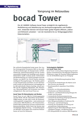 Vorsprung im Netzausbaubocad TowerDie 3D-CAD/BIM-Software bocad Tower erm%u00f6glicht die regelbasierte Modellierung und Detaillierung von Hochspannungsmasten und Plattformen. Anwender k%u00f6nnen mit bocad Tower gro%u00dfe Projekte effizient, pr%u00e4zise und fehlerarm umsetzen %u2013 von der Geometrie bis zur fertigungsgerechten Dokumentation.Der weltweite Energiebedarf steigt rasant. Der Ausbau leistungsstarker Stromnetze z%u00e4hlt zu den gr%u00f6%u00dften Herausforderungen der Energiewende, da Elektrifizierung, Industrieentwicklung und der Ausbau erneuerbarer Energien die Nachfrage nach robuster Infrastruktur rapide wachsen lassen. Insbesondere die Modernisierung von 110-kV-Leitungen sowie der Neubau von 400-kV- bis 765-kV-Trassen erfordern intelligente Planungsl%u00f6sungen. Der Mastbau geh%u00f6rt zu den komplexesten Gewerken: Je nach Streckenprofil werden auf 100 Kilometern Leitungsl%u00e4nge bis zu 400 individuelle Masten ben%u00f6tigt, jeweils perfekt auf die Umgebung abgestimmt. Zeit, Ressourcen, Wirtschaftlichkeit und Sicherheit sind dabei erfolgskritisch. Hier setzt bocad Tower an:bocad Tower f%u00fcr Netzumbauten und Neubaubocad Tower ist seit 1986 f%u00fcr Freileitungsmasten auf dem Markt. Mit der %u00dcbernahme durch SCHULLER&Company im Jahr 2022 wurde die Weiterentwicklung gezielt vorangetrieben %u2013 unter anderem mit verbesserten BIM-Workflows, IFC-Schnittstellen, Punktwolkenverarbeitung und einer modernisierten Benutzeroberfl%u00e4che. Heute bietet das System eine durchg%u00e4ngige digitale L%u00f6sung %u2013 von der Planung bis zur Montage. bocad eignet sich sowohl f%u00fcr Netzumbauten als auch f%u00fcr Neubauten.Technologische Highlights von bocad Tower 2025 bocad Tower vereint pr%u00e4zises Engineering mit intelligenter Automatisierung. Die folgenden integrierten Funktionen sorgen f%u00fcr messbare Effizienzgewinne von der 3D-Modellierung bis zur Fertigung:%u2022Effiziente 3D-Modellierung komplexer Mastgeometrien%u2022Automatische Verbindungen f%u00fcr Masten nach Best Practices der Branche%u2022Kundenspezifisch anpassbare Panel-Bibliotheken%u2022Kontrolle von Schraubenabst%u00e4nden, Scherkanten und Mindestabst%u00e4nden%u2022Kollisions- und Mindestabstandspr%u00fcfungen f%u00fcr Profile und Schrauben%u2022Automatische Positionsnummerierung%u2022Automatische Erstellung fertigungsspezifischer Unterlagen f%u00fcr Maststrukturen%u2022Mast-Mengenmultiplikator-Funktionen f%u00fcr Prototypen- und Serienfertigung%u2022Nutzung des 3D-Modells als Prototyp mit automatischer Fehlererkennung%u2022Optimierung der Materialbestellungen durch intelligente Stangen- und Blechmontage%u2022IFC-Kompatibilit%u00e4t f%u00fcr nahtlose BIM-IntegrationFotos: SCHULLER&CompanyScreenshot bocad Tower mit der modernisierten Benutzeroberfl%u00e4che der neuen Smart-Serie76Digitalisierung03 |25