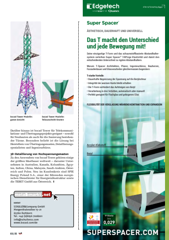 Dar%u00fcber hinaus ist bocad Tower f%u00fcr Telekommunikations- und %u00dcbertragungsprojekte geeignet %u2013 sowohl f%u00fcr Neubauten als auch f%u00fcr die Sanierung bestehender T%u00fcrme. Besonders beliebt ist die L%u00f6sung bei Herstellern von %u00dcbertragungsmasten, Detaillierungsspezialisten und Ingenieurb%u00fcros.3D-Detaillierung von HochspannungsmastenZu den Anwendern von bocad Tower geh%u00f6ren einige der gr%u00f6%u00dften Mastbauer weltweit %u2013 darunter Unternehmen in Australien, Kanada, Kolumbien, %u00c4gypten, Indien, China, Malaysia, Saudi-Arabien, %u00d6sterreich und Polen. Neu im Kundenkreis sind SPIE Energy Poland S.A., einer der f%u00fchrenden europ%u00e4ischen Dienstleister f%u00fcr Energieinfrastruktur sowie die TEBET GmbH aus %u00d6sterreich. %u2759KONTAKTSCHULLER&Company GmbHMergenthalerallee 15-2165760 EschbornTel. +49 (0)6196 7008201info@schullerco.comwww.bocad.com/debocad Tower Modelle: ganze Ansichtbocad Tower Modelle: Teilausschnitt Knoten%u03a8-Wertebis0,029ZERTIFIZIERTEKOMPON ENTEPassivhaus Institutarktisches KlimaphA+SUPERSPACER.COM%u00c4STHETISCH, DAUERHAFT UND UNIVERSELL Das T macht den Unterschied und jede Bewegung mit! Seine einzigartige T-Form und das schaumstoffbasierte Abstandhaltersystem verleihen Super Spacer%u00ae 100%ige Elastizit%u00e4t und damit den entscheidenden Unterschied zu rigiden Abstandhaltern. Warum T-Spacer Architekten, Planer, Ingenieurb%u00fcros, Bauherren, Fassadenbauer und Glasverarbeiter gleichermassen begeistern:T-starke Vorteile:%u2022 Dauerhafte Begrenzung der Spannung auf die Butylschnur%u2022 Integrit%u00e4t der warmen Kante bleibt erhalten%u2022 Die T-Form verhindert das Aufsteigen von Butyl%u2022 Verarbeitung in drei Schritten, automatisch oder manuell%u2022 Perfekt geeignet f%u00fcr Flachglas und gebogenes GlasFLEXIBILIT%u00c4T DER VERGLASUNG W%u00c4HREND KONTRAKTION UND EXPANSIONAcrylat-KlebstoffButyl03|25