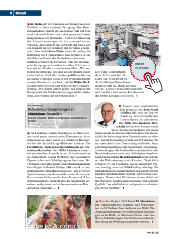 DIREKTZUM VIDEODr. Hahn gibt mit einem neuen Imagefilm einen Einblick in seine moderne Fertigung. Eine Drohnenaufnahme nimmt die Zuschauer mit auf eine eindrucksvolle Reise durch den gesamten Entstehungsprozess der T%u00fcrb%u00e4nder %u2013 von der Anlieferung der Aluminiumstangen bis hin zum weltweiten Versand. %u201eWie entsteht ein T%u00fcrband? Wir haben uns ein Beispiel an der Sendung mit der Maus genommen%u201c, beschreibt Klaus Weiss, Leiter Marketing, die Erstellung des Filmmaterials. Das Ergebnis ist ein detailliertes Portr%u00e4t der Produktionsstandorte. J%u00e4hrlich verlassen 20 Millionen Teile die mechanische Fertigung und werden in vielen Schritten zu kompletten B%u00e4ndern zusammengef%u00fchrt. %u201eWir verfolgen die Strategie, uns und unsere B%u00e4nder durch einen hohen Grad der Leistungsdifferenzierung zu einem wichtigen Glied in der Produktionskette unserer Kunden zu machen%u201c, erkl%u00e4rt Walter Back, Gesamtvertriebsleiter und Mitglied der Gesch%u00e4ftsleitung. %u201eWir haben immer gesagt, wir k%u00f6nnen die Komplexit%u00e4t der Marktanforderungen nicht verhindern, also wollen wir sie beherrschen.%u201cFoto: Dr. HahnDer Film verdeutlicht, dass Stillstand bei Dr. Hahn ein Fremdwort ist. Als familiengef%u00fchrtes Unternehmen setzt Dr. Hahn auf Innovation, h%u00f6chste Qualit%u00e4tsstandards und das klare Ziel, seinen Kunden stets die besten L%u00f6sungen zu bieten. y Bereits zum wiederholten Mal gelang es der Roto Frank Holding AG, sich im Top-10-Ranking mittelst%u00e4ndischer Unternehmen zu platzieren. Das DDW (Die Deutsche Wirtschaft) beobachtet Firmen sowie deren Tochterunternehmen mit einem Jahresumsatz bis zu einer Milliarde Euro. Um die tats%u00e4chliche Bedeutung eines Unternehmens zu erfassen, basiert das Scoring-System auf 39 Faktoren, die in unterschiedlicher Gewichtung einflie%u00dfen. Dazu geh%u00f6ren beispielsweise die Patentst%u00e4rke, Forschungsaufwendungen, die Online-Wahrnehmbarkeit oder Branchenkooperationen und Arbeitgeber-Angebote. Laut Alleinvorstand Dr. Eckhard Keill deckt sich das mit der Wahrnehmung durch Kunden: %u201eTats%u00e4chlich erhalten wir ein Feedback, das zu einhundert Prozent best%u00e4tigt, was das DDW-Ranking offenlegt. Die Menschen bei Roto konzentrieren sich auf die f%u00fcr ihre Kunden entscheidenden Produkt- und Service-Leistungen. Unsere drei Divisionen setzen dabei auf Innovationen, Operational Excellence und gepr%u00fcfte Qualit%u00e4t. Das wird belohnt und gerade in schwierigen Zeiten sichtbar.%u201c y Im Leichtbau sto%u00dfen Materialien an ihre Grenzen %u2013 und genau dort entstehen Erkenntnisse. Schadensanalysen sind daher ein zentraler Bestandteil bei der Entwicklung effizienter Systeme. Die Fortbildung %u201eSchadensuntersuchungen an Aluminium-Bauteilen%u201c der DGM-Akademie vermittelt praxisnahes Know-how zur Schadensanalyse an Aluminium, einem Werkstoff mit besonderen Eigenschaften und Sch%u00e4digungsmechanismen. Teil 1 behandelt metallurgische und schadenskundliche Grundlagen inklusive Gef%u00fcge, Mikrostruktur und lichtoptischer Bruchfl%u00e4chenanalyse. Teil 2 vertieft Spezialthemen wie Rasterelektronenmikroskopie, Korrosionssch%u00e4den sowie Ausschuss- und Schadensmanagement. Ideal f%u00fcr alle, die Aluminium verstehen, analysieren und sicher anwenden wollen.Zur DGM-Akademie %u2026 yGrafik: DGM-Akademie Noch bis 30. Juni 2025 bietet TS Aluminium f%u00fcr Terrassend%u00e4cher, Sommer- und Winterg%u00e4rten zw%u00f6lf Farben ohne Aufpreis zur Wahl. Die Aluminiumelemente der hochwertigen Systeme gibt es in Wei%u00df, in Rotbraun-T%u00f6nen und Anthrazit-Schattierungen. Der Farbton kann bei der Bestellung im Webshop ausgew%u00e4hlt werden. yFoto: TS AluminiumFoto:RotoFrankAG8Aktuell03|25