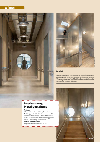 Fotos: Edward BeilerleAnerkennung MetallgestaltungProjekt: Wendelstein-Werkst%u00e4tten, Rosenheim Preistr%u00e4ger: Achim M. Kammerer und Prof. Veronika Kammerer, ARBEITSGEMEINSCHAFT studio lot PartGmbB| opposite office | hanfstingl architektenMetall- und Stahlbau:Siegfried W%u00f6lz GmbH & Co. KGJuryzitat:%u00bbDie Wendelstein-Werkst%u00e4tten in Rosenheim zeigen eindrucksvoll, wie funktionale Architektur, soziale Verantwortung und nachhaltiges Bauen miteinander verbunden werden k%u00f6nnen%u00ab82Forum03|25