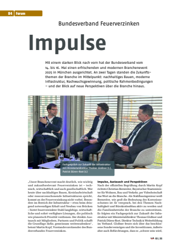 84Forum03|25Bundesverband FeuerverzinkenImpulseMit einem starken Blick nach vorn hat der Bundesverband vom 14. bis 16. Mai einen erfrischenden und modernen Branchenevent 2025 in M%u00fcnchen ausgerichtet. An zwei Tagen standen die Zukunftsthemen der Branche im Mittelpunkt: nachhaltiges Bauen, moderne Infrastruktur, Nachwuchsgewinnung, politische Rahmenbedingungen %u2013 und der Blick auf neue Perspektiven %u00fcber die Branche hinaus.%u201eUnser Branchenevent macht deutlich, wie wichtig und zukunftsrelevant Feuerverzinken ist %u2013 technisch, wirtschaftlich und auch gesellschaftlich. Wer heute %u00fcber nachhaltiges Bauen, Kreislaufwirtschaft oder ressourcenschonende Infrastrukturen spricht, kommt an der Feuerverzinkung nicht vorbei. Besonders im Bereich der Infrastruktur %u2013 etwa beim dringend notwendigen Erhalt und Neubau von Br%u00fccken %u2013 bietet feuerverzinkter Stahl langlebige, wirtschaftliche und sofort verf%u00fcgbare L%u00f6sungen, die politisch wie planerisch Priorit%u00e4t verdienen. Der direkte Austausch mit Mitgliedern, Partnern und Politik schafft die Grundlage daf%u00fcr, gemeinsam weiterzudenken%u201c, betont Martin Kopf, Vorstandsvorsitzender des Bundesverbandes Feuerverzinken.Impulse, Austausch und PerspektivenNach der offiziellen Begr%u00fc%u00dfung durch Martin Kopf richtete Christian Bernreiter, Bayerischer Staatsminister f%u00fcr Wohnen, Bau und Verkehr, per Videobotschaft das Wort an die Branche. Als Stahlbauingenieur wei%u00df Bernreiter, wie gro%u00df die Bedeutung des Korrosionsschutzes ist: Er versprach, bei den Themen Nachhaltigkeit und B%u00fcrokratieabbau aktiv zu werden und die Familienbetriebe der Branche zu unterst%u00fctzen. Es folgten ein Fachgespr%u00e4ch zur Zukunft der Infrastruktur mit Ministerialdirektor Thomas Glo%u00dfner und Patrick D%u00fcren-Rost, Direktor Technik & Weiterbildung im Verband. Glo%u00dfner freute sich %u00fcber das beschlossene Sonderverm%u00f6gen und die Investitionen, %u00e4u%u00dferte aber auch Bef%u00fcrchtungen, dass es %u201eschwer sein wird, Fachgespr%u00e4ch zur Zukunft der Infrastruktur mit Ministerialdirektor Thomas Glo%u00dfner (l.), Patrick D%u00fcren-Rost (r.)