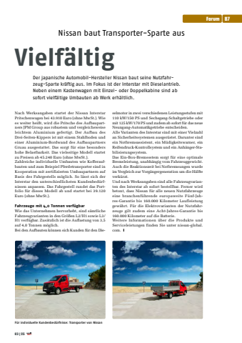 Nissan baut Transporter-Sparte ausVielf%u00e4ltigDer japanische Automobil-Hersteller Nissan baut seine Nutzfahrzeug-Sparte kr%u00e4ftig aus. Im Fokus ist der Interstar mit Dieselantrieb. Neben einem Kastenwagen mit Einzel- oder Doppelkabine sind ab sofort vielf%u00e4ltige Umbauten ab Werk erh%u00e4ltlich.Nach Werksangaben startet der Nissan Interstar Pritschenwagen bei 43.910 Euro (ohne MwSt.). Wie es weiter hei%u00dft, wird die Pritsche des Aufbaupartners JPM Group aus robustem und vergleichsweise leichtem Aluminium gefertigt. Der Aufbau des Drei-Seiten-Kippers ist mit einem Stahlboden und einer Aluminium-Bordwand des Aufbaupartners Gruau ausgestattet. Das sorgt f%u00fcr eine besonders hohe Belastbarkeit. Das vielseitige Modell startet zu Preisen ab 45.240 Euro (ohne MwSt.).Zahlreiche individuelle Umbauten wie Kofferaufbauten und zum Beispiel Pferdetransporter sind in Kooperation mit zertifizierten Umbaupartnern auf Basis des Fahrgestells m%u00f6glich. So l%u00e4sst sich der Interstar den unterschiedlichsten Kundenbed%u00fcrfnissen anpassen. Das Fahrgestell rundet das Portfolio f%u00fcr dieses Modell ab und startet bei 39.120 Euro (ohne MwSt.).Fahrzeuge mit 4,0 Tonnen verf%u00fcgbarWie das Unternehmen hervorhebt, sind s%u00e4mtliche Fahrzeugvarianten in den Gr%u00f6%u00dfen L2/H1 sowie L3/H1 verf%u00fcgbar. Zus%u00e4tzlich ist die Auflastung von 3,5 auf 4,0 Tonnen m%u00f6glich.Bei den Aufbauten k%u00f6nnen sich Kunden f%u00fcr den Dieselmotor in zwei verschiedenen Leistungsstufen mit 110 kW/150 PS und Sechsgang-Schaltgetriebe oder mit 125 kW/170 PS und zudem ab sofort f%u00fcr das neue Neungang-Automatikgetriebe entscheiden.Alle Varianten des Interstar sind mit einer Vielzahl an Sicherheitssystemen ausger%u00fcstet. Darunter sind ein Notbremsassistent, ein M%u00fcdigkeitswarner, ein Reifendruck-Kontrollsystem und ein Anh%u00e4nger-Stabilisierungssystem.Das Ein-Box-Bremssstem sorgt f%u00fcr eine optimale Bremsleistung, unabh%u00e4ngig vom Fahrzeuggewicht. Auch die Reaktionszeit bei Notbremsungen wurde im Vergleich zur Vorg%u00e4ngergeneration um die H%u00e4lfte verk%u00fcrzt.Und nach Werksangaben sind alle Fahrzeugvarianten des Interstar ab sofort bestellbar. Ferner wird betont, dass Nissan f%u00fcr alle neuen Nutzfahrzeuge eine branchenf%u00fchrende europaweite F%u00fcnf-Jahres-Garantie bis 160.000 Kilometer Laufleistung gew%u00e4hrt. F%u00fcr die Elektrovarianten der Nutzfahrzeuge gilt zudem eine Acht-Jahres-Garantie bis 160.000 Kilometer auf die Batterie.Weitere Informationen %u00fcber die Produkte und Serviceleistungen finden Sie unter nissan-global.com.yF%u00fcr individuelle Kundenbed%u00fcrfnisse: Transporter von NissanForum8703|25