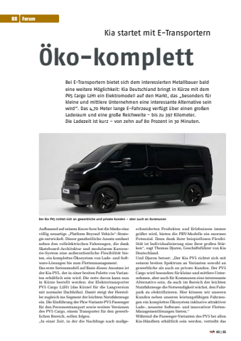Kia startet mit E-Transportern%u00d6ko-komplettBei E-Transportern bietet sich dem interessierten Metallbauer bald eine weitere M%u00f6glichkeit: Kia Deutschland bringt in K%u00fcrze mit dem PV5 Cargo L2H1 ein Elektromodell auf den Markt, das %u201ebesonders f%u00fcr kleine und mittlere Unternehmen eine interessante Alternative sein wird%u201c. Das 4,70 Meter lange E-Fahrzeug verf%u00fcgt %u00fcber einen gro%u00dfen Laderaum und eine gro%u00dfe Reichweite - bis zu 397 Kilometer. Die Ladezeit ist kurz %u2013 von zehn auf 80 Prozent in 30 Minuten. Aufbauend auf seinem Know-how hat die Marke eine v%u00f6llig neuartige %u201ePlatform Beyond Vehicle%u201c-Strategie entwickelt. Dieser ganzheitliche Ansatz umfasst neben den vollelektrischen Fahrzeugen, die dank Skateboard-Architektur und modularem Karosserie-System eine au%u00dferordentliche Flexibilit%u00e4t bieten, ein komplettes %u00d6kosystem von Lade- und Software-L%u00f6sungen bis zum Flottenmanagement. Das erste Serienmodell auf Basis dieses Ansatzes ist der Kia PV5, der in einer breiten Palette von Varianten erh%u00e4ltlich sein wird. Die erste davon kann nun in K%u00fcrze bestellt werden: der Elektrotransporter PV5 Cargo L2H1 (das K%u00fcrzel f%u00fcr die Langversion mit normaler Dachh%u00f6he). Damit steigt der Hersteller zugleich ins Segment der leichten Nutzfahrzeuge ein. Die Einf%u00fchrung der Pkw-Variante PV5 Passenger f%u00fcr den Personentransport sowie weitere Versionen des PV5 Cargo, einem Transporter f%u00fcr den gewerblichen Bereich, sollen folgen.%u201eIn einer Zeit, in der die Nachfrage nach ma%u00dfgeschneiderten Produkten und Erlebnissen immer gr%u00f6%u00dfer wird, bieten die PBV-Modelle ein enormes Potenzial. Denn dank ihrer beispiellosen Flexibilit%u00e4t ist Individualisierung eine ihrer gro%u00dfen St%u00e4rken%u201c, sagt Thomas Djuren, Gesch%u00e4ftsf%u00fchrer von Kia Deutschland. Und Djuren betont: %u201eDer Kia PV5 richtet sich mit seinem breiten Spektrum an Varianten sowohl an gewerbliche als auch an private Kunden. Der PV5 Cargo wird besonders f%u00fcr kleine und mittlere Unternehmen, aber auch f%u00fcr Kommunen eine interessante Alternative sein, da auch im Bereich der leichten Nutzfahrzeuge die Notwendigkeit w%u00e4chst, den Fuhrpark zu elektrifizieren. Hier k%u00f6nnen wir unseren Kunden neben unseren leistungsf%u00e4higen Fahrzeugen ein komplettes %u00d6kosystem inklusive attraktiver Lade-, neuester Software- und innovativer FlottenManagementl%u00f6sungen bieten.%u201cW%u00e4hrend die Passenger-Varianten des PV5 bei allen Kia-H%u00e4ndlern erh%u00e4ltlich sein werden, vertreibt das Der Kia PV5 richtet sich an gewerbliche und private Kunden %u2013 aber auch an Kommunen88Forum03|25
