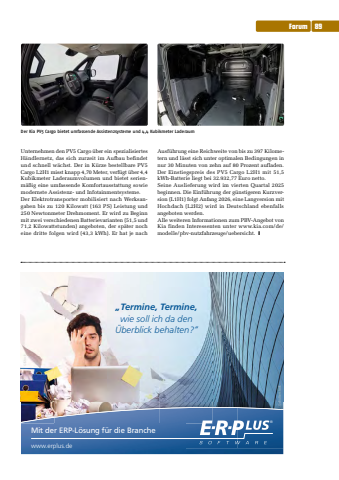Unternehmen den PV5 Cargo %u00fcber ein spezialisiertes H%u00e4ndlernetz, das sich zurzeit im Aufbau befindet und schnell w%u00e4chst. Der in K%u00fcrze bestellbare PV5 Cargo L2H1 misst knapp 4,70 Meter, verf%u00fcgt %u00fcber 4,4 Kubikmeter Laderaumvolumen und bietet serienm%u00e4%u00dfig eine umfassende Komfortausstattung sowie modernste Assistenz- und Infotainmentsysteme. Der Elektrotransporter mobilisiert nach Werksangaben bis zu 120 Kilowatt (163 PS) Leistung und 250 Newtonmeter Drehmoment. Er wird zu Beginn mit zwei verschiedenen Batterievarianten (51,5 und 71,2 Kilowattstunden) angeboten, der sp%u00e4ter noch eine dritte folgen wird (43,3 kWh). Er hat je nach Ausf%u00fchrung eine Reichweite von bis zu 397 Kilometern und l%u00e4sst sich unter optimalen Bedingungen in nur 30 Minuten von zehn auf 80 Prozent aufladen. Der Einstiegspreis des PV5 Cargo L2H1 mit 51,5 kWh-Batterie liegt bei 32.932,77 Euro netto. Seine Auslieferung wird im vierten Quartal 2025 beginnen. Die Einf%u00fchrung der g%u00fcnstigeren Kurzversion (L1H1) folgt Anfang 2026, eine Langversion mit Hochdach (L2H2) wird in Deutschland ebenfalls angeboten werden. Alle weiteren Informationen zum PBV-Angebot von Kia finden Interessenten unter www.kia.com/de/modelle/pbv-nutzfahrzeuge/uebersicht. yDer Kia PV5 Cargo bietet umfassende Assistenzsysteme und 4,4 Kubikmeter Laderaum%u201eTermine, Termine,wie soll ich da den %u00dcberblick behalten?%u201c%u00aewww.erplus.deMit der ERP-L%u00f6sung f%u00fcr die Branche%u00a9iStock%u00a9shutterstockAnzeigen_ERPlus.indd 201.02.21 11:21Forum89