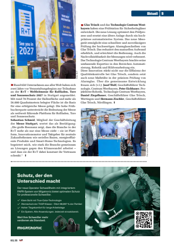 Schutz, der den Unterschied machtDer neue Operator Schwei%u00dfhelm mit integriertem PAPR-System von Migatronic bietet optimalen Schutz f%u00fcr professionelle Schwei%u00dfer.Weil Ihre Schwei%u00dfer mehr verdienen als Standard.Klare Sicht mit True-Color-Technologie Atemschutz der TH3P-Klasse %u2013 filtert 99,997 % der Partikel Hoher Tragekomfort f%u00fcr lange Arbeitstage Ein System. Alle Anwendungen. Jederzeit einsatzbereit. Rund 650 Unternehmen aus aller Welt haben sich zwei Jahre vor Veranstaltungsbeginn zur Teilnahme an der R+T %u2013 Weltleitmessef%u00fcr Rollladen, Tore und Sonnenschutz 2027 in Stuttgart angemeldet. Mit rund 78 Prozent der Hallenfl%u00e4che und mehr als 56.000 Quadratmetern belegter Fl%u00e4che ist die Basis f%u00fcr eine erfolgreiche Messe gelegt. Die hohe Fr%u00fchbucherquote unterstreicht die Bedeutung der Messe als weltweit f%u00fchrende Plattform f%u00fcr Rollladen, Tore und Sonnenschutz.Sebastian Schmid, Mitglied der Gesch%u00e4ftsleitung der Messe Stuttgart, wertet das als Best%u00e4tigung: %u201eDie gro%u00dfe Resonanz zeigt, dass die Branche in der R+T mehr als nur eine Messe sieht %u2013 sie ist Plattform, Innovationsmotor und Taktgeber f%u00fcr zentrale Zukunftsthemen wie serielles Bauen, energieeffiziente Produkte und Smart-Home-Technologien. Es begeistert mich, wie stark die Branche gemeinsam an L%u00f6sungen gegen den Klimawandel arbeitet %u2013 und dass sie der R+T dabei konstant ihr Vertrauen schenkt.%u201c yGlas Tr%u00f6sch und das Technologie Centrum Westbayern haben eine Pr%u00fcfstation f%u00fcr Sicherheitsgl%u00e4ser entwickelt. Die neue L%u00f6sung optimiert den Pr%u00fcfprozess und ersetzt eine %u00e4ltere Anlage durch ein hochpr%u00e4zises automatisiertes System. Das neue Messger%u00e4t erm%u00f6glicht eine schnellere und zuverl%u00e4ssigere Pr%u00fcfung der hochwertigen Alarmglasscheiben von Glas Tr%u00f6sch. Das reduziert den manuellen Aufwand erheblich, und erleichtert die Bedienung. Auch die Nachvollziehbarkeit der Messungen wird verbessert. Das Technologie Centrum Westbayern brachte seine umfassende Expertise in den Bereichen Automatisierung, Robotik und Bildverarbeitung ein.Diese Innovation st%u00e4rkt nicht nur die Effizienz der Qualit%u00e4tskontrolle bei Glas Tr%u00f6sch, sondern setzt auch neue Ma%u00dfst%u00e4be in der pr%u00e4zisen Pr%u00fcfung von Alarmglas. %u00dcber die gemeinsame Entwicklung freuen sich (v.l.): Josef Wolf, Gesch%u00e4ftsf%u00fchrer Technologie, Centrum Westbayern, Peter Eichbauer, Projektleiter Robotik, Technologie Centrum Westbayern, Daniel Ziegelbauer, Gesch%u00e4ftsf%u00fchrer Glas Tr%u00f6sch, Wertingen und Hermann Zischler, Gesch%u00e4ftsf%u00fchrer Glas Tr%u00f6sch, N%u00f6rdlingen. yFoto: Josef WolfFoto: R+TAktuell903|25