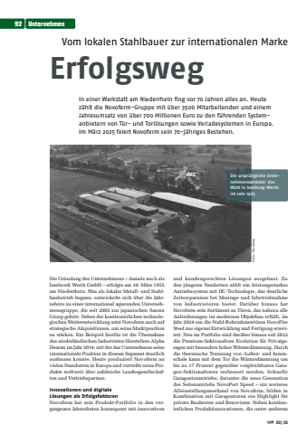 Vom lokalen Stahlbauer zur internationalen MarkeErfolgswegIn einer Werkstatt am Niederrhein fing vor 70 Jahren alles an. Heute z%u00e4hlt die Novoferm-Gruppe mit %u00fcber 3500 Mitarbeitenden und einem Jahresumsatz von %u00fcber 700 Millionen Euro zu den f%u00fchrenden Systemanbietern von T%u00fcr- und Torl%u00f6sungen sowie Verladesystemen in Europa. Im M%u00e4rz 2025 feiert Novoferm sein 70-j%u00e4hriges Bestehen.Die Gr%u00fcndung des Unternehmens %u2013 damals noch als Isselwerk Werth GmbH %u2013 erfolgte am 10. M%u00e4rz 1955 am Niederrhein. Was als lokaler Metall- und Stahlbaubetrieb begann, entwickelte sich %u00fcber die Jahrzehnte zu einer international agierenden Unternehmensgruppe, die seit 2003 zur japanischen Sanwa Group geh%u00f6rt. Neben der kontinuierlichen technologischen Weiterentwicklung setzt Novoferm auch auf strategische Akquisitionen, um seine Marktposition zu st%u00e4rken. Ein Beispiel hierf%u00fcr ist die %u00dcbernahme des niederl%u00e4ndischen Industrietor-Herstellers Alpha Deuren im Jahr 2014, mit der das Unternehmen seine internationale Position in diesem Segment deutlich ausbauen konnte. Heute produziert Novoferm an vielen Standorten in Europa und vertreibt seine Produkte weltweit %u00fcber zahlreiche Landesgesellschaften und Vertriebspartner. Innovationen und digitale L%u00f6sungen als ErfolgsfaktorenNovoferm hat sein Produkt-Portfolio in den vergangenen Jahrzehnten konsequent mit innovativen und kundengerechten L%u00f6sungen ausgebaut. Zu den j%u00fcngsten Neuheiten z%u00e4hlt ein leistungsstarkes Antriebssystem mit DC-Technologie, das deutliche Zeitersparnisse bei Montage und Inbetriebnahme von Industrietoren bietet. Dar%u00fcber hinaus hat Novoferm sein Sortiment an T%u00fcren, das nahezu alle Anforderungen im modernen Objektbau erf%u00fcllt, im Jahr 2024 um die Stahl-Rohrrahment%u00fcren NovoFire Steel aus eigener Entwicklung und Fertigung erweitert. Neu im Portfolio sind dar%u00fcber hinaus seit 2022 die Premium-Sektionaltore Evolution f%u00fcr Privatgaragen mit besonders hoher W%u00e4rmed%u00e4mmung. Durch die thermische Trennung von Au%u00dfen- und Innenschale kann mit dem Tor die W%u00e4rmed%u00e4mmung um bis zu 17 Prozent gegen%u00fcber vergleichbaren Garagen-Sektionaltoren verbessert werden. Schnelle Garagentorantriebe, darunter die neue Generation des Seitenantriebs NovoPort Speed %u2013 ein weiteres Alleinstellungsmerkmal von Novoferm, bilden in Kombination mit Garagentoren ein Highlight f%u00fcr private Bauherren und Renovierer. Neben kontinuierlichen Produktinnovationen, die unter anderem Fotos: NovofermDie urspr%u00fcngliche Unternehmenszentrale: das Werk in Isselburg-Werth im Jahr 196392Unternehmen03|25