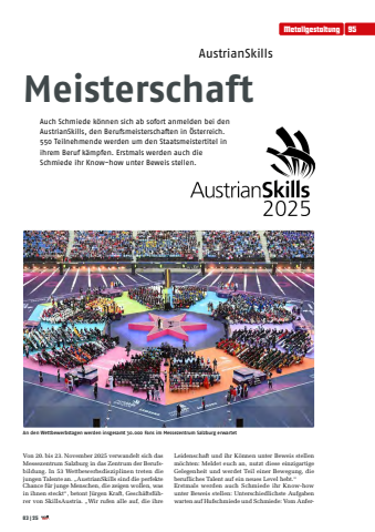 An den Wettbewerbstagen werden insgesamt 30.000 Fans im Messezentrum Salzburg erwartetAustrianSkillsMeisterschaftAuch Schmiede k%u00f6nnen sich ab sofort anmelden bei den AustrianSkills, den Berufsmeisterschaften in %u00d6sterreich. 550 Teilnehmende werden um den Staatsmeistertitel in ihrem Beruf k%u00e4mpfen. Erstmals werden auch die Schmiede ihr Know-how unter Beweis stellen.Von 20. bis 23. November 2025 verwandelt sich das Messezentrum Salzburg in das Zentrum der Berufsbildung. In 53 Wettbewerbsdisziplinen treten die jungen Talente an. %u201eAustrianSkills sind die perfekte Chance f%u00fcr junge Menschen, die zeigen wollen, was in ihnen steckt%u201c, betont J%u00fcrgen Kraft, Gesch%u00e4ftsf%u00fchrer von SkillsAustria. %u201eWir rufen alle auf, die ihre Leidenschaft und ihr K%u00f6nnen unter Beweis stellen m%u00f6chten: Meldet euch an, nutzt diese einzigartige Gelegenheit und werdet Teil einer Bewegung, die berufliches Talent auf ein neues Level hebt.%u201c Erstmals werden auch Schmiede ihr Know-how unter Beweis stellen: Unterschiedlichste Aufgaben warten auf Hufschmiede und Schmiede: Vom AnferMetallgestaltung9503|25
