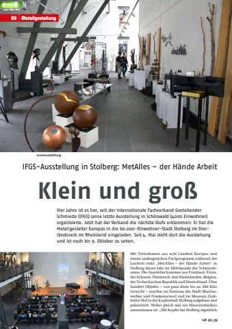 98Metallgestaltung03|25IFGS-Ausstellung in Stolberg: MetAlles %u2013 der H%u00e4nde ArbeitKlein und gro%u00dfVier Jahre ist es her, seit der Internationale Fachverband Gestaltender Schmiede (IFGS) seine letzte Ausstellung in Sch%u00f6nwald (4000 Einwohner) organisierte. Jetzt hat der Verband die n%u00e4chste Stufe erklommen: Er hat die Metallgestalter Europas in die 60.000-Einwohner-Stadt Stolberg im Dreil%u00e4ndereck im Rheinland eingeladen. Seit 4. Mai steht dort die Ausstellung und ist noch bis 9. Oktober zu sehen.Mit Teilnehmern aus acht L%u00e4ndern Europas und einem umfangreichen Fachprogramm w%u00e4hrend der Laufzeit steht %u201eMetAlles %u2013 der H%u00e4nde Arbeit%u201c in Stolberg dieses Jahr im Mittelpunkt der Schmiedeszene. Die Aussteller kommen aus Finnland, Polen, der Schweiz, %u00d6sterreich, den Niederlanden, Belgien, der Tschechischen Republik und Deutschland. %u00dcber hundert Objekte %u2013 von ganz klein bis zu 300 Kilo Gewicht %u2013 wurden im Zentrum der Stadt (Bastinsweiher und Frankenwiese) und im Museum Zinkh%u00fctter Hof in der Kupferstadt Stolberg aufgebaut und pr%u00e4sentiert. Wobei gleich mal ein Missverst%u00e4ndnis auszur%u00e4umen ist: %u201eMit Kupfer hat Stolberg eigentlich Innenausstellung