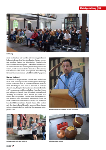 Metallgestaltung9903|25nicht viel zu tun, wir wurden mit Messingprodukten bekannt, die aus dem hier abgebauten Galmei gewonnen wurden. Galmei ein feink%u00f6rniges Gemisch, das durch die Verwitterung von Zinkblende entsteht und oft als Grundstoff zur Messingherstellung verwendet wird%u201d, wei%u00df Museumsleiter Sebastian Wenzler zu berichten und hat somit auch gleich die Erkl%u00e4rung f%u00fcr den Museumsnamen %u201eZinkh%u00fctter Hof%u201c gegeben. Warum Stolberg? Initiator war B%u00fcrgermeister Patrick Haas. Er lud den IFGS nach Stolberg ein und %u00fcberzeugte die Metallgestalter und Schmiede, in seine Heimatstadt zu kommen. Stolberg ist eine von 15 St%u00e4dten in Europa, die sich im %u201eRing der Europ%u00e4ischen Schmiedest%u00e4dte e.V.%u201d zusammengeschlossen haben. Haas fand einen gewichtigeren Grund, den Schmiedeverband nach Stolberg einzuladen. 2021 wurde die Stadt von einem katastrophalen Hochwasser heimgesucht. Die rei%u00dfende Flut w%u00e4lzte sich meterhoch durch die Stadt und hinterlie%u00df Sch%u00e4den in H%u00f6he von mehreren hundert Millionen Euro. Patrick Haas: %u201eWir wollen mit der Ausstellung MetAlles unseren Einwohnern zeigen, dass die Kultur nicht im Hochwasser untergehen kann.%u201dBu%u0308rgermeister Patrick Haas bei der Ero%u0308ffnungEro%u0308ffnungAnlieferung Martin Holl mit FrauStilleben beim Aufbau