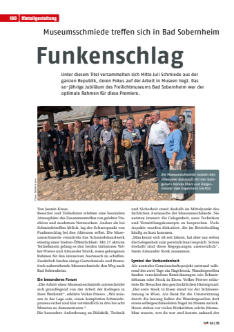 100Metallgestaltung04|25FunkenschlagMuseumsschmiede treffen sich in Bad SobernheimUnter diesem Titel versammelten sich Mitte Juli Schmiede aus der ganzen Republik, deren Fokus auf der Arbeit in Museen liegt. Das 50-j%u00e4hrige Jubil%u00e4um des Freilichtmuseums Bad Sobernheim war der optimale Rahmen f%u00fcr diese Premiere. Von Jasmin KruseBesucher und Teilnehmer erlebten eine besondere Atmosph%u00e4re: das Zusammentreffen von gelebter Tradition und modernen Netzwerken. Anders als bei Schmiedetreffen %u00fcblich, lag der Schwerpunkt von Funkenschlag bei den Akteuren selbst. Die Museumsschmiede vermitteln das Schmiedehandwerk st%u00e4ndig einer breiten %u00d6ffentlichkeit. Mit 27 aktiven Teilnehmern gelang es den beiden Initiatoren Volker Priewe und Alexander Storck, einen gelungenen Rahmen f%u00fcr den intensiven Austausch zu schaffen. Zus%u00e4tzlich fanden einige Gastschmiede und thematisch nahestehende Messerschmiede den Weg nach Bad Sobernheim.Ein besonderes Forum %u201eDie Arbeit eines Museumsschmieds unterscheidet sich grundlegend von der Arbeit der Kollegen in ihrer Werkstatt%u201c, erkl%u00e4rte Volker Priewe. %u201eWir m%u00fcssen in der Lage sein, einen kompletten Schmiedeprozess sicher und klar verst%u00e4ndlich in drei bis acht Minuten zu demonstrieren.%u201c Die besondere Anforderung an Didaktik, Technik und Sicherheit stand deshalb im Mittelpunkt des fachlichen Austauschs der Museumsschmiede. Sie nutzten intensiv die Gelegenheit, neue Techniken und Vermittlungskonzepte zu besprechen. Viele Aspekte wurden diskutiert, die im Betriebsalltag h%u00e4ufig zu kurz kommen. %u201eMan kennt sich oft seit Jahren, hat aber nur selten die Gelegenheit zum pers%u00f6nlichen Gespr%u00e4ch. Schon deshalb sind diese Begegnungen unersetzlich%u201c, fasste Alexander Stork zusammen.Symbol der VerbundenheitAls zentrales Gemeinschaftsprojekt entstand w%u00e4hrend der zwei Tage ein Nagelstock. Wandergesellen fanden verschiedene Bezeichnungen wie Schmiedebaum oder Stock in Eisen. Volker Priewe erl%u00e4uterte f%u00fcr Besucher den geschichtlichen Hintergrund: %u201eDer erste Stock in Eisen stand vor der Schlosserinnung in Wien. Als Dank f%u00fcr die Unterst%u00fctzung durch die Innung lie%u00dfen die Wandergesellen dort einen selbstgeschmiedeten Nagel im Stamm zur%u00fcck. Heute stehen vor vielen Werkst%u00e4tten solche B%u00e4ume. Man wusste, wer da war und konnte anhand der Die Museumsschmiede nutzten den intensiven Austausch mit den Gastgebern Monika Ebers und B%u00fcrgermeister Uwe Engelmann (rechts)Fotos: Martin Kruse