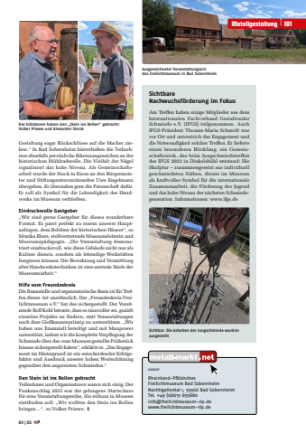 Metallgestaltung10104|25Gestaltung sogar R%u00fcckschl%u00fcsse auf die Macher ziehen.%u201c In Bad Sobernheim hinterlie%u00dfen die Teilnehmer ebenfalls pers%u00f6nliche Erkennungszeichen an der historischen M%u00fchlradwelle. Die Vielfalt der N%u00e4gel signalisiert das hohe Niveau. Als Gemeinschaftsarbeit wurde der Stock in Eisen an den B%u00fcrgermeister und Stiftungsratsvorsitzenden Uwe Engelmann %u00fcbergeben. Er %u00fcbernahm gern die Patenschaft daf%u00fcr.Er soll als Symbol f%u00fcr die Lebendigkeit des Handwerks im Museum verbleiben. Eindrucksvolle Gastgeber%u201eWir sind gerne Gastgeber f%u00fcr dieses wunderbare Format. Es passt perfekt zu einem unserer Hauptanliegen, dem Beleben der historischen H%u00e4user%u201c, so Monika Ebers, stellvertretende Museumsleiterin und Museumsp%u00e4dagogin. %u201eDie Veranstaltung demonstriert eindrucksvoll, wie diese Geb%u00e4ude nicht nur als Kulisse dienen, sondern als lebendige Werkst%u00e4tten fungieren k%u00f6nnen. Die Bewahrung und Vermittlung alter Handwerkstechniken ist eine zentrale S%u00e4ule der Museumsarbeit.%u201cHilfe vom FreundeskreisDie finanzielle und organisatorische Basis ist f%u00fcr Treffen dieser Art unerl%u00e4sslich. Der %u201eFreundeskreis Freilichtmuseum e.V.%u201c hat das sichergestellt. Der Vorsitzende Rolf Kehl betonte, dass es sinnvoller sei, gezielt einzelne Projekte zu f%u00f6rdern, statt Veranstaltungen nach dem Gie%u00dfkannenprinzip zu unterst%u00fctzen. %u201eWir haben uns finanziell beteiligt und mit Manpower unterst%u00fctzt, indem wir die komplette Verpflegung der Schmiede %u00fcber das vom Museum gestellte Fr%u00fchst%u00fcck hinaus sichergestellt haben%u201c, erkl%u00e4rte er. %u201eDas Engagement im Hintergrund ist ein entscheidender Erfolgsfaktor und Ausdruck unserer hohen Wertsch%u00e4tzung gegen%u00fcber den angereisten Schmieden.%u201cDen Stein ist ins Rollen gebrachtTeilnehmer und Organisatoren waren sich einig: Der Funkenschlag 2025 war der gelungene Startschuss f%u00fcr eine Veranstaltungsreihe, die reihum in Museen stattfinden soll. %u201eWir wollten den Stein ins Rollen bringen%u2026%u201c, so Volker Priewe. yKONTAKTRheinland-Pf%u00e4lzisches Freilichtmuseum Bad SobernheimNachtigallental 1, 55566 Bad SobernheimTel. +49 (0)6751 855880info@freilichtmuseum-rlp.dewww.freilichtmuseum-rlp.deSichtbare Nachwuchsf%u00f6rderung im FokusAm Treffen haben einige Mitglieder aus dem Internationalen Fachverband Gestaltender Schmiede e.V. (IFGS) teilgenommen. Auch IFGS-Pr%u00e4sident Thomas-Maria Schmidt war vor Ort und unterstrich das Engagement und die Notwendigkeit solcher Treffen. Er lieferte einen besonderen Blickfang: ein Gemeinschaftswerk, das beim Jungschmiedetreffen des IFGS 2023 in Dinkelsb%u00fchl entstand: Die Skulptur %u2013 zusammengesetzt aus individuell geschmiedeten St%u00e4ben, diente im Museum als kraftvolles Symbol f%u00fcr die internationale Zusammenarbeit, die F%u00f6rderung der Jugend und das hohe Niveau der n%u00e4chsten Schmiedegeneration. Informationen: www.ifgs.deDie Initiatoren haben den %u201eStein ins Rollen%u201c gebracht: Volker Priewe und Alexander StorckAusgezeichneter Veranstaltungsort: das Freilichtmuseum in Bad SobernheimSichtbar: Die Arbeiten der Jungschmiede wurden ausgestellt