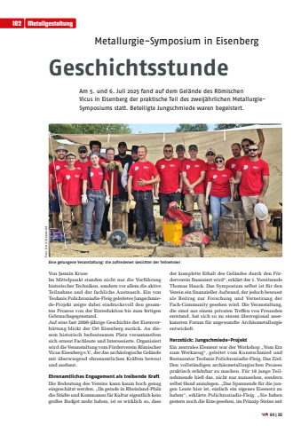 102Metallgestaltung04|25Metallurgie-Symposium in EisenbergGeschichtsstundeAm 5. und 6. Juli 2025 fand auf dem Gel%u00e4nde des R%u00f6mischen Vicus in Eisenberg der praktische Teil des zweij%u00e4hrlichen MetallurgieSymposiums statt. Beteiligte Jungschmiede waren begeistert.Von Jasmin KruseIm Mittelpunkt standen nicht nur die Vorf%u00fchrung historischer Techniken, sondern vor allem die aktive Teilnahme und der fachliche Austausch. Ein von Teofanis Polichroniadis-Fleig geleitetes Jungschmiede-Projekt zeigte dabei eindrucksvoll den gesamten Prozess von der Erzreduktion bis zum fertigen Gebrauchsgegenstand.Auf eine fast 2000-j%u00e4hrige Geschichte der Eisenverh%u00fcttung blickt der Ort Eisenberg zur%u00fcck. An diesem historisch bedeutsamen Platz versammelten sich erneut Fachleute und Interessierte. Organisiert wird die Veranstaltung vom F%u00f6rderverein R%u00f6mischer Vicus Eisenberg e.V., der das arch%u00e4ologische Gel%u00e4nde mit %u00fcberwiegend ehrenamtlichen Kr%u00e4ften betreut und ausbaut.Ehrenamtliches Engagement als treibende KraftDie Bedeutung des Vereins kann kaum hoch genug eingesch%u00e4tzt werden. %u201eDa gerade in Rheinland-Pfalz die St%u00e4dte und Kommunen f%u00fcr Kultur eigentlich kein gro%u00dfes Budget mehr haben, ist es wirklich so, dass der komplette Erhalt des Gel%u00e4ndes durch den F%u00f6rderverein finanziert wird%u201c, erkl%u00e4rt der 1. Vorsitzende Thomas Hauck. Das Symposium selbst ist f%u00fcr den Verein ein finanzieller Aufwand, der jedoch bewusst als Beitrag zur Forschung und Vernetzung der Fach-Community gesehen wird. Die Veranstaltung, die einst aus einem privaten Treffen von Freunden entstand, hat sich so zu einem %u00fcberregional anerkannten Forum f%u00fcr angewandte Arch%u00e4ometallurgie entwickelt.Herzst%u00fcck: Jungschmiede-ProjektEin zentrales Element war der Workshop %u201eVom Erz zum Werkzeug%u201c, geleitet vom Kunstschmied und Restaurator Teofanis Polichroniadis-Fleig. Das Ziel: Den vollst%u00e4ndigen arch%u00e4ometallurgischen Prozess praktisch erfahrbar zu machen. F%u00fcr 18 junge Teilnehmende hie%u00df das, nicht nur zuzusehen, sondern selbst Hand anzulegen. %u201eDas Spannende f%u00fcr die jungen Leute hier ist, einfach ein eigenes Eisenerz zu haben%u201c, erkl%u00e4rte Polichroniadis-Fleig. %u201eSie haben gestern noch die Erze gesehen, im Prinzip Steine mit Foto: Jerrit Gru%u0308newaldEine gelungene Veranstaltung: die zufriedenen Gesichter der Teilnehmer