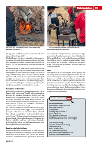 Metallgestaltung10304|25KONTAKTE UND ANMELDUNGENF%u00f6rderverein R%u00f6mischer VicusEisenberg (Pfalz) e.V.Thomas HauckTheodor-Storm-Stra%u00dfe 3367304 EisenbergTel. +49 (0)6359 4090190info@foerderverein.vicus-eisenberg.dewww.foerderverein.vicus-eisenberg.deTP MetallgestaltungTeofanis Polichroniadis-FleigViktoriastra%u00dfe 1968723 SchwetzingenTel. +49 (0)6202 9508384kontakt@tp-metallgestaltung.dewww.tp-metallgestaltung.deEisengehalt, und haben dann hier im Rennofen ihr eigenes Eisen hergestellt.%u201c Die Erfahrung, das eigene Material im Ursprung zu verstehen, ist auch ein zentrales Anliegen des Internationalen Fachverbands Gestaltender Schmiede e.V. (IFGS), der die Veranstaltung finanziell unterst%u00fctzt hat.Um den Einstieg zu erleichtern, wurde am ersten Tag ein hochhaltiges brasilianisches Eisenerz verh%u00fcttet. Die eigentliche Herausforderung folgte am zweiten Tag: die Verarbeitung eines Erzes aus Thrakien (Nordgriechenland), das sich laut Polichroniadis-Fleig als %u201ezickig%u201c erwies und trotz vielversprechender Analysen schwer zu reduzieren war. Dennoch gelang es, eine zusammenh%u00e4ngende Luppe zu gewinnen, die direkt im Anschluss weiterbearbeitet wurde.Reduktion im RennofenDie beim Symposium verwendeten Renn%u00f6fen, Nachbauten nach r%u00f6mischem Vorbild, arbeiten nach dem Prinzip der direkten Reduktion. Dabei wird das Eisenerz bei Temperaturen um 1200 Grad Celsius reduziert, ohne dass das Eisen selbst schmilzt. Die nicht-eisenhaltigen Bestandteile verfl%u00fcssigen sich zur Schlacke und %u201erinnen%u201c aus dem Ofen %u2013 ein Prozess, der dem Ofen seinen Namen gab.Im Zentrum der Brennkammer verbleibt ein teigiger, por%u00f6ser Eisenklumpen: die Luppe. Diese ist, anders als das spr%u00f6de Roheisen aus Hoch%u00f6fen, direkt schmiedbar. %u201eDirekt schmiedbar%u201c bedeutet jedoch nicht %u201esofort fertig%u201c. Die Luppe muss in einem aufwendigen Prozess durch wiederholtes Erhitzen, Schmieden und Falten verdichtet und von verbliebenen Schlackeresten befreit werden, um ein homogenes und nutzbares Schmiedeeisen zu erhalten.Experimentelle Arch%u00e4ologie Die Rekonstruktion der %u00d6fen selbst ist ein Kernthema der experimentellen Arch%u00e4ologie. Da vollst%u00e4ndige Ofenfunde extrem selten sind, basiert der Aufbau auf einer Kombination aus gesicherten Befunden und fundierten Interpretationen. %u201eEine der wenigen gesicherten Brennkammern misst etwa 46 Zentimeter H%u00f6he und befindet sich im Landesmuseum Rheinland-Pfalz in Speyer%u201c, so Polichroniadis-Fleig. %u201eAlles, was dar%u00fcber ist, ist geraten%u201c und beruht auf praktischer Erfahrung und Annahmen, etwa zur Nutzung des Kamineffekts.FazitDas Symposium in Eisenberg hat erneut gezeigt, wie lebendige Wissensvermittlung funktioniert. Es verzahnt arch%u00e4ologische Forschung mit handwerklicher Praxis und schafft es, Fachpublikum, Nachwuchskr%u00e4fte und historisch Interessierte zusammenzubringen. Der praxisnahe Ansatz, bei dem die Teilnehmer den Weg vom Stein zum Metall mit eigenen H%u00e4nden nachvollziehen, macht die komplexen historischen Prozesse greifbar und sichert den Fortbestand wertvollen Erfahrungswissens. y%u2026 und anschlie%u00dfend in einem aufw%u00e4ndigen Prozesswiederholt erw%u00e4rmt und verdichtet Die Luppe wird nach vielen Stunden harter Arbeit dem Rennofen entnommen %u2026