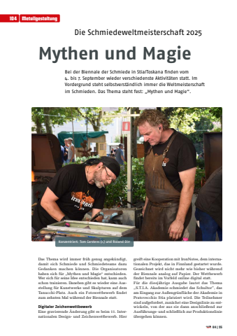 104Metallgestaltung04|25Die Schmiedeweltmeisterschaft 2025Mythen und MagieBei der Biennale der Schmiede in Stia/Toskana finden vom 4. bis 7. September wieder verschiedenste Aktivit%u00e4ten statt. Im Vordergrund steht selbstverst%u00e4ndlich immer die Weltmeisterschaft im Schmieden. Das Thema steht fest: %u201eMythen und Magie%u201c.Das Thema wird immer fr%u00fch genug angek%u00fcndigt, damit sich Schmiede und Schmiedeteams dazu Gedanken machen k%u00f6nnen. Die Organisatoren haben sich f%u00fcr %u201eMythen und Magie%u201c entschieden. Wer sich f%u00fcr seine Idee entschieden hat, kann auch schon trainieren. Daneben gibt es wieder eine Ausstellung f%u00fcr Kunstwerke und Skulpturen auf dem Tanucchi-Platz. Auch ein Fotowettbewerb findet zum zehnten Mal w%u00e4hrend der Biennale statt. Digitaler ZeichenwettbewerbEine gravierende %u00c4nderung gibt es beim 11. Internationalen Design- und Zeichenwettbewerb. Hier greift eine Kooperation mit IronNotes, dem internationalen Projekt, das in Finnland gestartet wurde. Gezeichnet wird nicht mehr wie bisher w%u00e4hrend der Biennale analog auf Papier. Der Wettbewerb findet bereits im Vorfeld online digital statt. F%u00fcr die diesj%u00e4hrige Ausgabe lautet das Thema %u201eS.T.I.A. Akademie schmiedet das Schultor%u201d, das am Eingang zur Au%u00dfengr%u00fcnfl%u00e4che der Akademie in Pratovecchio Stia platziert wird. Die Teilnehmer sind aufgefordert, zun%u00e4chst eine Designlinie zu entwickeln, von der aus sie dann anschlie%u00dfend zur Ausf%u00fchrungs- und schlie%u00dflich zur Produktionslinie %u00fcbergehen k%u00f6nnen.Konzentriert: Tom Carstens (r.) und Roland Dirr