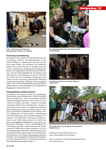 Metallgestaltung10704|25Foto: Henrietta MitchellFoto: Enna ElorantaErinnerung und Bedeutung Im Rahmen der IronNotes-Veranstaltung fand die Ausstellung %u201eMemory and Remembering%u201c in der Galerie Pihatto in Lappeenranta statt. Die Ausstellung zeigte Werke von Studenten der bildenden K%u00fcnste der LAB-University of Applied Sciences sowie von Studenten der Estnischen Akademie der K%u00fcnste und eingeladenen internationalen Gastk%u00fcnstlern. An zwei Tagen begr%u00fc%u00dfte die Ausstellung rund 200 Besucher. Am Schlusstag wurde der Innenhof der Galerie mit Live-Schmiedevorf%u00fchrungen zum Leben erweckt, bei denen professionelle Schmiede traditionelle Techniken vorf%u00fchrten. Die Ausstellung zeigte, wie sich die Metallgestaltung durch Materialexperimente, kulturellen Dialog und %u00f6ffentliches Engagement weiterentwickelt. Metallgestaltung messbar gemacht Im Rahmen des Seminars stellte die Nachhaltigkeitsexpertin Saara Korpela den %u201eTurku Ecological Guide for Public Art%u201c und ein innovatives Tool f%u00fcr umweltvertr%u00e4gliche k%u00fcnstlerische Arbeit vor: den %u201eGreen Art Carbon Calculator%u201c. Dieses in Finnland entwickelte Online-Tool soll K%u00fcnstlern, Kuratoren und Produzenten helfen, die Klimaauswirkungen ihrer kreativen Prozesse zu verstehen und zu reduzieren. Der Rechner erm%u00f6glicht es den Nutzern, den CO2-Fu%u00dfabdruck von Kunstwerken, Ausstellungen und Veranstaltungen unter Ber%u00fccksichtigung von Faktoren wie Materialien, Transport, Energieverbrauch und Abfall abzusch%u00e4tzen. Es bietet eine klare und zug%u00e4ngliche M%u00f6glichkeit, um zu sehen, wo Emissionen entstehen %u2013 und wo nachhaltigere Entscheidungen getroffen werden k%u00f6nnen. Bei Kunstwerken im %u00f6ffentlichen Raum handelt es sich oft um gro%u00dfformatige Materialien, Herstellungsprozesse und internationale Logistik. Durch den Einsatz eines CO2-Rechners in der fr%u00fchen Planungsphase k%u00f6nnen K%u00fcnstler und Auftraggeber fundierte Entscheidungen %u00fcber Materialauswahl, Produktionsmethoden und Installationsstrategien treffen. yEisen - Erinnerung und Bedeutung: Kunststudenten machten sich GedankenProbieren Sie den Rechner hier aus: www.vihreataide.fi/en/calculatorInfo zu IronNotes und den kommenden Events:www.ironnotes.euLive-Schmiedevorf%u00fchrung in der Gallerie Pihatto in LappeenrantaAusstellung IronNotes in der Gallerie Pihatto in LappeenrantaDie Projekt-Partner und Studenten von IronNotes in Taipalsaari 2025Foto: Enna Eloranta