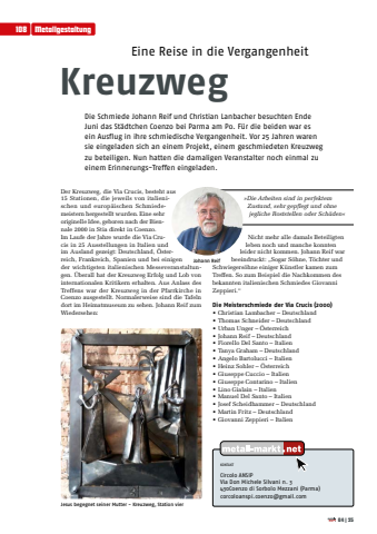 Eine Reise in die VergangenheitKreuzwegDie Schmiede Johann Reif und Christian Lanbacher besuchten Ende Juni das St%u00e4dtchen Coenzo bei Parma am Po. F%u00fcr die beiden war es ein Ausflug in ihre schmiedische Vergangenheit. Vor 25 Jahren waren sie eingeladen sich an einem Projekt, einem geschmiedeten Kreuzweg zu beteiligen. Nun hatten die damaligen Veranstalter noch einmal zu einem Erinnerungs-Treffen eingeladen. Der Kreuzweg, die Via Crucis, besteht aus 15 Stationen, die jeweils von italienischen und europ%u00e4ischen Schmiedemeistern hergestellt wurden. Eine sehr originelle Idee, geboren nach der Biennale 2000 in Stia direkt in Coenzo. Im Laufe der Jahre wurde die Via Crucis in 25 Ausstellungen in Italien und im Ausland gezeigt: Deutschland, %u00d6sterreich, Frankreich, Spanien und bei einigen der wichtigsten italienischen Messeveranstaltungen. %u00dcberall hat der Kreuzweg Erfolg und Lob von internationalen Kritikern erhalten. Aus Anlass des Treffens war der Kreuzweg in der Pfarrkirche in Coenzo ausgestellt. Normalerweise sind die Tafeln dort im Heimatmuseum zu sehen. Johann Reif zum Wiedersehen: %u00bbDie Arbeiten sind in perfektem Zustand, sehr gepflegt und ohne jegliche Roststellen oder Sch%u00e4den%u00abNicht mehr alle damals Beteiligten leben noch und manche konnten leider nicht kommen. Johann Reif war beeindruckt: %u201eSogar S%u00f6hne, T%u00f6chter und Schwiegers%u00f6hne einiger K%u00fcnstler kamen zum Treffen. So zum Beispiel die Nachkommen des bekannten italienischen Schmiedes Giovanni Zeppieri.%u201c Die Meisterschmiede der Via Crucis (2000)%u2022 Christian Lambacher %u2013 Deutschland%u2022 Thomas Schneider %u2013 Deutschland%u2022 Urban Unger %u2013 %u00d6sterreich%u2022 Johann Reif %u2013 Deutschland%u2022 Fiorello Del Santo %u2013 Italien%u2022 Tanya Graham %u2013 Deutschland%u2022 Angelo Bartolucci %u2013 Italien%u2022 Heinz Sohler %u2013 %u00d6sterreich%u2022 Giuseppe Cuccio %u2013 Italien%u2022 Giuseppe Contarino %u2013 Italien%u2022 Lino Gialain %u2013 Italien%u2022 Manuel Del Santo %u2013 Italien%u2022 Josef Scheidhammer %u2013 Deutschland%u2022 Martin Fritz %u2013 Deutschland%u2022 Giovanni Zeppieri %u2013 Italien Jesus begegnet seiner Mutter - Kreuzweg, Station vierJohann Reif108Metallgestaltung04|25KONTAKTCircolo ANSIPVia Don Michele Silvani n. 3430Coenzo di Sorbolo Mezzani (Parma)corcoloanspi.coenzo@gmail.com