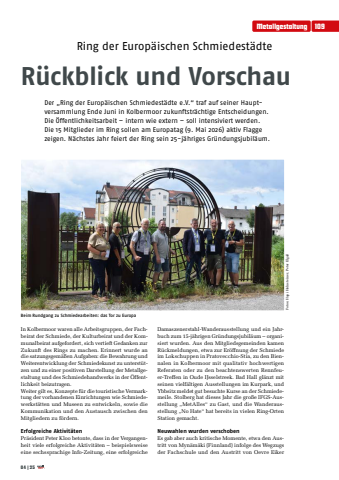 R%u00fcckblick und VorschauDer %u201eRing der Europ%u00e4ischen Schmiedest%u00e4dte e.V.%u201c traf auf seiner Hauptversammlung Ende Juni in Kolbermoor zukunftstr%u00e4chtige Entscheidungen. Die %u00d6ffentlichkeitsarbeit %u2013 intern wie extern %u2013 soll intensiviert werden. Die 15 Mitglieder im Ring sollen am Europatag (9. Mai 2026) aktiv Flagge zeigen. N%u00e4chstes Jahr feiert der Ring sein 25-j%u00e4hriges Gr%u00fcndungsjubil%u00e4um.In Kolbermoor waren alle Arbeitsgruppen, der Fachbeirat der Schmiede, der Kulturbeirat und der Kommunalbeirat aufgefordert, sich vertieft Gedanken zur Zukunft des Rings zu machen. Erinnert wurde an die satzungsgem%u00e4%u00dfen Aufgaben: die Bewahrung und Weiterentwicklung der Schmiedekunst zu unterst%u00fctzen und zu einer positiven Darstellung der Metallgestaltung und des Schmiedehandwerks in der %u00d6ffentlichkeit beizutragen.Weiter gilt es, Konzepte f%u00fcr die touristische Vermarktung der vorhandenen Einrichtungen wie Schmiedewerkst%u00e4tten und Museen zu entwickeln, sowie die Kommunikation und den Austausch zwischen den Mitgliedern zu f%u00f6rdern.Erfolgreiche Aktivit%u00e4tenPr%u00e4sident Peter Kloo betonte, dass in der Vergangenheit viele erfolgreiche Aktivit%u00e4ten %u2013 beispielsweise eine sechssprachige Info-Zeitung, eine erfolgreiche Damaszenerstahl-Wanderausstellung und ein Jahrbuch zum 15-j%u00e4hrigen Gr%u00fcndungsjubil%u00e4um %u2013 organisiert wurden. Aus den Mitgliedsgemeinden kamen R%u00fcckmeldungen, etwa zur Er%u00f6ffnung der Schmiede im Lokschuppen in Pratovecchio-Stia, zu den Biennalen in Kolbermoor mit qualitativ hochwertigen Referaten oder zu den beachtenswerten Rennfeuer-Treffen in Oude IJsselstreek. Bad Hall gl%u00e4nzt mit seinen vielf%u00e4ltigen Ausstellungen im Kurpark, und Ybbsitz meldet gut besuchte Kurse an der Schmiedemeile. Stolberg hat dieses Jahr die gro%u00dfe IFGS-Ausstellung %u201eMetAlles%u201c zu Gast, und die Wanderausstellung %u201eNo Hate%u201c hat bereits in vielen Ring-Orten Station gemacht.Neuwahlen wurden verschobenEs gab aber auch kritische Momente, etwa den Austritt von Myn%u00e4m%u00e4ki (Finnland) infolge des Wegzugs der Fachschule und den Austritt von Oevre Eiker Fotos: Hapi Holnsteiner, Peter Elga%u00dfBeim Rundgang zu Schmiedearbeiten: das Tor zu EuropaMetallgestaltung10904|25Ring der Europ%u00e4ischen Schmiedest%u00e4dte