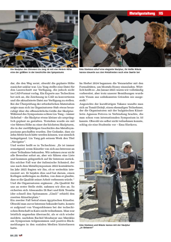 Metallgestaltung11504|25dar, die den Weg weist, obwohl die geplante H%u00f6he zun%u00e4chst unklar war. Liu Yang stellte eine Datei f%u00fcr den Laserschnitt zur Verf%u00fcgung, die jedoch nicht im CAD-Format vorlag. Ein Experte aus Tschechien bot sich an, die Zeichnung in CAD zu konvertieren und die aktualisierte Datei zur Verf%u00fcgung zu stellen. Bei der %u00dcberpr%u00fcfung der erforderlichen Materialien zeigte man sich im Organisatoren-Stab etwas beunruhigt %u00fcber die offensichtliche Gr%u00f6%u00dfe der Skulptur.W%u00e4hrend des Symposiums schien Liu Yang %u2013 immer l%u00e4chelnd %u2013 die Skulptur etwas kleiner als urspr%u00fcnglich geplant zu gestalten. Trotzdem wurde sie mit vier Metern H%u00f6he zu einer der h%u00f6chsten Skulpturen, die in der zw%u00f6lfj%u00e4hrigen Geschichte des Metallsymposiums geschaffen wurden. Der Gedanke, dass sie zehn Meter hoch h%u00e4tte werden k%u00f6nnen, war ziemlich be%u00e4ngstigend. Liu Yang gab seinem Werk den Titel %u201eNavigator%u201d.Und weiter hei%u00dft es in Tschechien: %u201eEs ist immer ermutigend, wenn K%u00fcnstler von sich aus Interesse an einer Teilnahme bekunden. Wir nehmen zwar nicht alle Bewerber sofort an, aber wir f%u00fchren eine Liste und kommen gelegentlich auf ihr Interesse zur%u00fcck. Ein solcher Fall war der italienische Schmied, der uns nach dem Metallsymposium 2022 kontaktierte. Im Jahr 2025 fragten wir ihn, ob er weiterhin interessiert sei. Er bejahte dies und bat darum, einen Kollegen mitbringen zu d%u00fcrfen, von dem er glaubte, dass er die Qualit%u00e4t seiner Arbeit verbessern w%u00fcrde.%u201cUnd die Organisatoren erg%u00e4nzen: %u201eDa Qualit%u00e4t f%u00fcr uns an erster Stelle steht, nahmen wir dies an. So sicherten sich Alessandro Di Bari und Erik Tromba (der schnell den Spitznamen %u201eGimli%u201d erhielt) den zweiten K%u00fcnstlerplatz.%u201cEin zweiter Fall betraf einen %u00e4gyptischen K%u00fcnstler. Obwohl man zuvor Interesse bekundet hatte, konnte er aufgrund von Visaproblemen bei der tschechischen Botschaft in Kairo nicht teilnehmen. Man war letztlich angenehm %u00fcberrascht, als er sich wieder meldete, nachdem Rachid Mouhayar aus Marokko am Symposium teilgenommen und positive R%u00fcckmeldungen in den sozialen Medien hinterlassen hatte.Im Herbst 2024 begannen die Veranstalter mit den Formalit%u00e4ten, um Mostafa Hosny einzuladen. W%u00f6rtlich hei%u00dft es: %u201eIm Januar 2025 waren wir vollst%u00e4ndig vorbereitet, aber trotz unserer Bem%u00fchungen wurde sein Visum aus unbekannten Gr%u00fcnden nie ausgestellt.%u201cAngesichts der kurzfristigen Vakanz wandte man sich an Tom%u00e1%u0161 Dolej%u0161, einen ehemaligen Teilnehmer, der die Organisatoren mit der bulgarischen K%u00fcnstlerin Agnessa Petrova in Verbindung brachte, die man schon vom internationalen Symposium in A%u0161 kannte. Obwohl sie selbst nicht teilnehmen konnte, schlug sie eine Studentin vor %u2013 Ema Slavkova.Die Skulptur des Chinesen Liu Jang ist mit vier Metern H%u00f6he eine der gr%u00f6%u00dften in der Geschichte des SymposiumsEma Slavkova schuf eine elegante Skulptur, ihr Helfer NikolaIvanov steuerte aus den Metallresten noch eine Zweite beiEma Slavkova und Nikola Ivanov mit der Skulptur%u201eIn Between%u201d