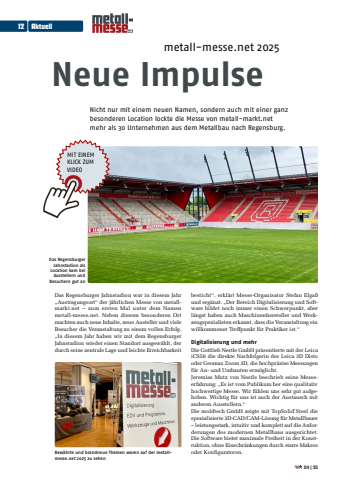 metall-messe.net 2025Neue ImpulseNicht nur mit einem neuen Namen, sondern auch mit einer ganz besonderen Location lockte die Messe von metall-markt.net mehr als 30 Unternehmen aus dem Metallbau nach Regensburg.Das Regensburger Jahnstadion war in diesem Jahr %u201eAustragungsort%u201c der j%u00e4hrlichen Messe von metallmarkt.net %u2013 zum ersten Mal unter dem Namen metall-messe.net. Neben diesem besonderen Ort machten auch neue Inhalte, neue Austeller und viele Besucher die Veranstaltung zu einem vollen Erfolg.%u201eIn diesem Jahr haben wir mit dem Regensburger Jahnstadion wieder einen Standort ausgew%u00e4hlt, der durch seine zentrale Lage und leichte Erreichbarkeit besticht%u201c, erkl%u00e4rt Messe-Organisator Stefan Elga%u00df und erg%u00e4nzt: %u201eDer Bereich Digitalisierung und Software bildet noch immer einen Schwerpunkt, aber l%u00e4ngst haben auch Maschinenhersteller und Werkzeugspezialisten erkannt, dass die Veranstaltung ein willkommener Treffpunkt f%u00fcr Praktiker ist.%u201cDigitalisierung und mehrDie Gottlieb Nestle GmbH pr%u00e4sentierte mit der Leica iCS50 die direkte Nachfolgerin des Leica 3D Disto oder Geomax Zoom 3D, die hochpr%u00e4zise Messungen f%u00fcr An- und Umbauten erm%u00f6glicht.Jeremias Mutz von Nestle beschrieb seine Messeerfahrung: %u201eEs ist vom Publikum her eine qualitativ hochwertige Messe. Wir f%u00fchlen uns sehr gut aufgehoben. Wichtig f%u00fcr uns ist auch der Austausch mit anderen Ausstellern.%u201cDie moldtech GmbH zeigte mit TopSolid%u2019Steel die spezialisierte 3D-CAD/CAM-L%u00f6sung f%u00fcr Metallbauer %u2013 leistungsstark, intuitiv und komplett auf die Anforderungen des modernen Metallbaus ausgerichtet. Die Software bietet maximale Freiheit in der Konstruktion, ohne Einschr%u00e4nkungen durch starre Makros oder Konfiguratoren.MIT EINEMKLICK ZUMVIDEODas Regensburger Jahnstadion als Location kam bei Ausstellern und Besuchern gut anBew%u00e4hrte und brandneue Themen waren auf der metallmesse.net 2025 zu sehen12Aktuell04|25