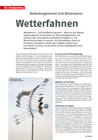 120Metallgestaltung04|25Bedeutungsverlust und RenaissanceWetterfahnenWetterfahnen %u2013 auch Windfahnen genannt %u2013 z%u00e4hlen zu den %u00e4ltesten meteorologischen Instrumenten der Menschheitsgeschichte. Ihre schlichte, aber wirkungsvolle Konstruktion erm%u00f6glicht es, die Windrichtung sichtbar zu machen. Seit Jahrhunderten zieren sie Kircht%u00fcrme, Hausd%u00e4cher, Schiffe oder Flugh%u00e4fen. Welche Funktion erf%u00fcllen sie heute und wo finden sich f%u00fcr Metallgestalter neue Anwendungen?Die Urspr%u00fcnge der Wetterfahne lassen sich bis in die Antike zur%u00fcckverfolgen. Die %u00e4lteste bekannte Darstellung ist der sogenannte Turm der Winde in Athen (circa 50 vor Christus), auf dem sich eine drehbare Figur des Meeresgottes Triton befand, die als Windrichtungsanzeiger fungierte. In Europa verbreitete sich die Nutzung der Wetterfahne im Mittelalter zunehmend auf Kirchen und Burgen. Besonders beliebt waren symboltr%u00e4chtige Formen wie Drachen, H%u00e4hne oder heraldische Tiere. So kennt man die RichtungsanzeigerDer Wetterhahn, wie man ihn oft auf Kirchturmspitzen sieht, wurde zum verbreitetsten Motiv. Papst Nikolaus I. ordnete im neunten Jahrhundert an, dass jeder Kirchturm mit einem Hahn versehen sein sollte %u2013 als Symbol f%u00fcr Wachsamkeit und die biblische Geschichte vom Hahnenschrei nach Petrus%u2019 Verleugnung Christi. Wetterfahnen waren %u00fcber Jahrhunderte klassische Zierelemente historischer und moderner Bauwerke. Besonders auf Kircht%u00fcrmen, Schl%u00f6ssern und Burgen und B%u00fcrgerh%u00e4usern. Sie dienen hier neben ihrer funktionalen Bedeutung auch als Schmuck und Statussymbol.Billigware auf dem MarktHeute finden wir vielfach billige und einfach gefertigte kleinere Windfahnen mit klassischen Motiven f%u00fcr den Garten. Sie sind meist aus Blech gelasert und unbehandelt, damit sie Rost ansetzen k%u00f6nnen. Abgebildet werden Tiere, Pflanzen und technische Motive. Nicht selten stammen diese Wetterfahnen aus Werkst%u00e4tten in Fernost. Durch die Massenanfertigung und die niedrigen Lohnkosten k%u00f6nnen hier europ%u00e4ische Metallgestalterbetriebe preislich nicht mithalten.Marktnische mit ZukunftGanz im Gegensatz dazu finden heimische Metallgestalter mit modern gestalteten Windfahnen, Windr%u00e4dern und Windspielen eine Marktnische, die durchaus attraktiv ist. Dem Ideenreichtum sind dabei kaum Grenzen gesetzt. Zeitgem%u00e4%u00dfe Formen und Herstellungsweisen, unterschiedliche Materialien und fantasievolle Farbgebung machen den Unterschied zur Massenware. Vielfach haben individuell gestaltete Wetterfahnen die fr%u00fchere Verwendung auf D%u00e4chern und Giebeln verlassen und als Skulpturen G%u00e4rten und Parkanlagen erobert. Bei aller Vielfalt und unterschiedlicher Form ist allen Wetterfahnen eines gleich. Die Hauptfunktion einer Wetterfahne Ein Windspiel zeigt keine Windrichtung an