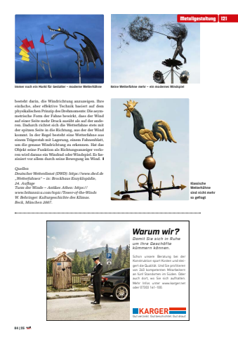 Metallgestaltung12104|25Immer noch ein Markt f%u00fcr Gestalter - moderne Wetterh%u00e4hneKeine Wetterfahne mehr - ein modernes Windspielbesteht darin, die Windrichtung anzuzeigen. Ihre einfache, aber effektive Technik basiert auf dem physikalischen Prinzip des Drehmoments: Die asymmetrische Form der Fahne bewirkt, dass der Wind auf einer Seite mehr Druck aus%u00fcbt als auf der anderen. Dadurch richtet sich die Wetterfahne stets mit der spitzen Seite in die Richtung, aus der der Wind kommt. In der Regel besteht eine Wetterfahne aus einem Tr%u00e4gerstab mit Lagerung, einem Fahnenblatt, um die genaue Windrichtung zu erkennen. Hat das Objekt seine Funktion als Richtungsanzeiger verloren wird daraus ein Windrad oder Windspiel. Es fasziniert vor allem durch seine Bewegung im Wind. yQuellenDeutscher Wetterdienst (DWD): https://www.dwd.de%u201eWetterfahnen%u201c %u2013 in: Brockhaus Enzyklop%u00e4die, 24. AuflageTurm der Winde %u2013 Antikes Athen: https://www.britannica.com/topic/Tower-of-the-WindsW. Behringer: Kulturgeschichte des Klimas. Beck, M%u00fcnchen 2007.Schon unsere Beratung bei der Konstruktion spart Kosten und steigert die Qualit%u00e4t. Und Sie profitieren von 240 kompetenten Mitarbeitern an f%u00fcnf Standorten im S%u00fcden. Oder auch dort, wo Sie sich aufhalten. Mehr Infos unter www.karger.net oder 07303 161-100. Damit Sie sich in Ruhe um Ihre Gesch%u00e4fte k%u00fcmmern k%u00f6nnen.Warum wir?KARGERGut verzinkt. Gut beschichtet. Gut drauf.KlassischeWetterh%u00e4hne sind nicht mehr so gefragt