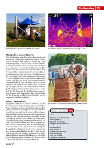Metallgestaltung12304|25Fl%u00fcssiges Eisen aus dem StahlofenDie Verbindung zwischen altem Handwerk und moderner Technologie wurde bei diesem Projekt durch das HO-Team Historic Ironmaking (TataSteel) hergestellt. Unter all den Lehmschacht%u00f6fen nimmt dieses Team eine Sonderstellung ein. Nicht nur wegen des verwendeten Stahlofens, sondern auch, weil dieser Ofen mit der Produktion von fl%u00fcssigem Eisen beginnen musste, was nach Jahren des Experimentierens an beiden Produktionstagen in Ulft gelang. Der Ofen produzierte insgesamt 25 Kilo fl%u00fcssiges Eisen, zusammen mit der vorhandenen fl%u00fcssigen Schlacke. Durch eine Reihe von Verbesserungen wurde das endg%u00fcltige Ziel, fl%u00fcssiges Eisen mit einem nur 1,5 Meter hohen Hochofen zu erzeugen, erreicht. Das Abstechen dauerte an beiden Tagen mindestens vier Stunden, was nat%u00fcrlich f%u00fcr das Team und die Zuschauer ein spannendes Erlebnis war. Das n%u00e4chste Ziel dieses Teams ist die Trennung von Eisen und Schlacke, um ein sauberes Produkt zu erhalten. Projekt %u201eUmweltschutz%u201d%u00dcbrigens steht der Konzern TataSteel in der Gemeinde Beverwijk derzeit wegen seiner hohen Umweltbelastung in der Kritik. Das Abfallprodukt %u201eStahlschlacke%u201c verursacht auch eine starke Bodenverschmutzung und wurde unter anderem in gro%u00dfem Umfang im Wegebau verwendet. Als Arbeitgeber von rund 2000 Menschen in Beverwijk ist jede Schlie%u00dfung politisch sehr heikel. Die niederl%u00e4ndische Regierung erw%u00e4gt eine kr%u00e4ftige Subvention, um das Unternehmen umweltfreundlicher zu gestalten.Die Veranstaltung wurde von der Arbeitsgruppe der Gemeinde Oude Ijsselstreek im %u201eRing der Europ%u00e4ischen Schmiedest%u00e4dte e.V.%u201d organisiert. Der Schmied Paul Klaasen hat das Projekt auf die Beine gestellt und intensiv gearbeitet, um es zu einem Erfolg zu machen. Dabei konnte er auf sieben Freiwillige aus seiner Schmiede f%u00fcr den Auf- und Abbau und den Service zur%u00fcckgreifen. yKONTAKTRathaus Oude-IJsselstreekStaringstraat 257081 BN Gendringeninfo@oude-ijsselstreek.nlProjektleitung:Paul KlaasenSmederij Klein ProjektSilvoldseweg 837061 DM Terborginfo@kleinprojekt.nlDer Stahlofen des HO-Teams von TataSteel in BetriebDer TataSteel-Ofen mit der W%u00e4rmebildkamera aufgenommenEin Rennofen wird abwechselnd mit Holzkohle und Erz beschickt