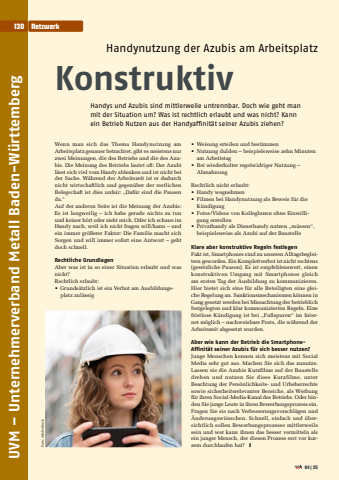 Handynutzung der Azubis am ArbeitsplatzUVM %u2013 Unternehmerverband Metall Baden-W%u00fcrttembergKonstruktivHandys und Azubis sind mittlerweile untrennbar. Doch wie geht man mit der Situation um? Was ist rechtlich erlaubt und was nicht? Kann ein Betrieb Nutzen aus der Handyaffinit%u00e4t seiner Azubis ziehen?Wenn man sich das Thema Handynutzung am Arbeitsplatz genauer betrachtet, gibt es meistens nur zwei Meinungen, die des Betriebs und die des Azubis. Die Meinung des Betriebs lautet oft: Der Azubi l%u00e4sst sich viel vom Handy ablenken und ist nicht bei der Sache. W%u00e4hrend der Arbeitszeit ist er dadurch nicht wirtschaftlich und gegen%u00fcber der restlichen Belegschaft ist dies unfair: %u201eDaf%u00fcr sind die Pausen da.%u201cAuf der anderen Seite ist die Meinung der Azubis: Es ist langweilig %u2013 ich habe gerade nichts zu tun und keiner h%u00f6rt oder sieht mich. Oder ich schaue im Handy nach, weil ich nicht fragen will/kann %u2013 und ein immer gr%u00f6%u00dferer Faktor: Die Familie macht sich Sorgen und will immer sofort eine Antwort %u2013 geht doch schnell.Rechtliche GrundlagenAber was ist in so einer Situation erlaubt und was nicht?Rechtlich erlaubt:%u2022Grunds%u00e4tzlich ist ein Verbot am Ausbildungsplatz zul%u00e4ssig%u2022Weisung erteilen und bestimmen%u2022Nutzung dulden %u2013 beispielsweise zehn Minuten am Arbeitstag%u2022Bei wiederholter regelwidriger Nutzung %u2013 AbmahnungRechtlich nicht erlaubt:%u2022Handy wegnehmen%u2022Filmen bei Handynutzung als Beweis f%u00fcr die K%u00fcndigung%u2022Fotos/Videos von KollegInnen ohne Einwilligung erstellen%u2022Privathandy als Diensthandy nutzen %u201em%u00fcssen%u201c, beispielsweise als Azubi auf der BaustelleKlare aber konstruktive Regeln festlegenFakt ist, Smartphones sind zu unseren Alltagsbegleitern geworden. Ein Komplettverbot ist nicht rechtens (gesetzliche Pausen). Es ist empfehlenswert, einen konstruktiven Umgang mit Smartphones gleich am ersten Tag der Ausbildung zu kommunizieren. Hier bietet sich eine f%u00fcr alle Beteiligten eine gleiche Regelung an. Sanktionsmechanismen k%u00f6nnen in Gang gesetzt werden bei Missachtung der betrieblich festgelegten und klar kommunizierten Regeln. Eine fristlose K%u00fcndigung ist bei %u201eFu%u00dfspuren%u201c im Internet m%u00f6glich %u2013 nachweisbare Posts, die w%u00e4hrend der Arbeitszeit abgesetzt wurden.Aber wie kann der Betrieb die SmartphoneAffinit%u00e4t seiner Azubis f%u00fcr sich besser nutzen?Junge Menschen kennen sich meistens mit Social Media sehr gut aus. Machen Sie sich das zunutze. Lassen sie die Azubis Kurzfilme auf der Baustelle drehen und nutzen Sie diese Kurzfilme, unter Beachtung der Pers%u00f6nlichkeits- und Urheberrechte sowie sicherheitsrelevanter Bereiche, als Werbung f%u00fcr ihren Social-Media-Kanal des Betriebs. Oder binden Sie junge Leute in ihren Bewerbungsprozess ein. Fragen Sie sie nach Verbesserungsvorschl%u00e4gen und %u00c4nderungsw%u00fcnschen. Schnell, einfach und %u00fcbersichtlich sollen Bewerbungsprozesse mittlerweile sein und wer kann ihnen das besser vermitteln als ein junger Mensch, der diesen Prozess erst vor kur-Foto: AdobeStockzem durchlaufen hat? y04|25130Netzwerk