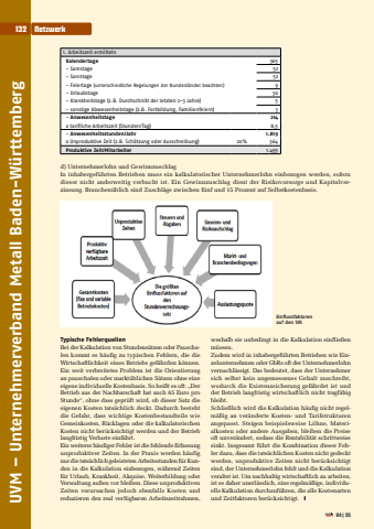 UVM %u2013 Unternehmerverband Metall Baden-W%u00fcrttembergd) Unternehmerlohn und Gewinnzuschlag In inhabergef%u00fchrten Betrieben muss ein kalkulatorischer Unternehmerlohn einbezogen werden, sofern dieser nicht anderweitig verbucht ist. Ein Gewinnzuschlag dient der Risikovorsorge und Kapitalverzinsung. Branchen%u00fcblich sind Zuschl%u00e4ge zwischen f%u00fcnf und 15 Prozent auf Selbstkostenbasis.Typische FehlerquellenBei der Kalkulation von Stundens%u00e4tzen oder Pauschalen kommt es h%u00e4ufig zu typischen Fehlern, die die Wirtschaftlichkeit eines Betriebs gef%u00e4hrden k%u00f6nnen. Ein weit verbreitetes Problem ist die Orientierung an pauschalen oder markt%u00fcblichen S%u00e4tzen ohne eine eigene individuelle Kostenbasis. So hei%u00dft es oft: %u201eDer Betrieb aus der Nachbarschaft hat auch 65 Euro pro Stunde%u201c, ohne dass gepr%u00fcft wird, ob dieser Satz die eigenen Kosten tats%u00e4chlich deckt. Dadurch besteht die Gefahr, dass wichtige Kostenbestandteile wie Gemeinkosten, R%u00fccklagen oder die kalkulatorischen Kosten nicht ber%u00fccksichtigt werden und der Betrieb langfristig Verluste einf%u00e4hrt.Ein weiterer h%u00e4ufiger Fehler ist die fehlende Erfassung unproduktiver Zeiten. In der Praxis werden h%u00e4ufig nur die tats%u00e4chlich geleisteten Arbeitsstunden f%u00fcr Kunden in die Kalkulation einbezogen, w%u00e4hrend Zeiten f%u00fcr Urlaub, Krankheit, Akquise, Weiterbildung oder Verwaltung au%u00dfen vor bleiben. Diese unproduktiven Zeiten verursachen jedoch ebenfalls Kosten und reduzieren den real verf%u00fcgbaren Arbeitszeitrahmen, weshalb sie unbedingt in die Kalkulation einflie%u00dfen m%u00fcssen.Zudem wird in inhabergef%u00fchrten Betrieben wie Einzelunternehmen oder GbRs oft der Unternehmerlohn vernachl%u00e4ssigt. Das bedeutet, dass der Unternehmer sich selbst kein angemessenes Gehalt zuschreibt, wodurch die Existenzsicherung gef%u00e4hrdet ist und der Betrieb langfristig wirtschaftlich nicht tragf%u00e4hig bleibt.Schlie%u00dflich wird die Kalkulation h%u00e4ufig nicht regelm%u00e4%u00dfig an ver%u00e4nderte Kosten- und Tarifstrukturen angepasst. Steigen beispielsweise L%u00f6hne, Materialkosten oder andere Ausgaben, bleiben die Preise oft unver%u00e4ndert, sodass die Rentabilit%u00e4t schrittweise sinkt. Insgesamt f%u00fchrt die Kombination dieser Fehler dazu, dass die tats%u00e4chlichen Kosten nicht gedeckt werden, unproduktive Zeiten nicht ber%u00fccksichtigt sind, der Unternehmerlohn fehlt und die Kalkulation veraltet ist. Um nachhaltig wirtschaftlich zu arbeiten, ist es daher unerl%u00e4sslich, eine regelm%u00e4%u00dfige, individuelle Kalkulation durchzuf%u00fchren, die alle Kostenarten und Zeitfaktoren ber%u00fccksichtigt. yEinflussfaktoren auf den SVS 1. Arbeitszeit ermittelnKalendertage365- Samstage52- Sonntage52- Feiertage (unterschiedliche Regelungen der Bundesl%u00e4nder beachten)9- Urlaubstage 30- Krankheitstage (z.B. Durchschnitt der letzten 2-3 Jahre)5- sonstige Abwesenheitstage (z.B. Fortbildung, Familienfeiern)3- Anwesenheitstage214x tarifliche Arbeitszeit (Stunden/Tag)8,5- Anwesenheitsstunden/Jahr1.819x Unproduktive Zeit (z.B. Sch%u00e4tzung oder Ausschreibung)20%364Produktive Zeit/Mitarbeiter1.45504|25132Netzwerk