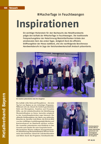 Inspirationen#MacherTage in FeuchtwangenEin wichtiger Meilenstein f%u00fcr den Nachwuchs des Metallhandwerks pr%u00e4gte den Auftakt der #MacherTage in Feuchtwangen. Die traditionelleFreisprechungsfeier der Metallinnung Westmittelfranken bildete den emotionalen Kern des ersten Tages. Zeitgleich fand die offizielle Er%u00f6ffnungsfeier der Messe stattfand, ehe die nachfolgende Berufsmesse Handwerksberufe im Zuge der Kreishandwerkerschaft Ansbach pr%u00e4sentierte.Fotos: Team StrohmeierDie Gesellen pr%u00e4sentierten stolz ihre ZeugnisseEin Auftakt voller Stolz und Perspektiven %u2013 der erste Tag bot von Beginn an ein vielseitiges Programm. W%u00e4hrend sich am Abend die festlich geschm%u00fcckte Halle mit Ehreng%u00e4sten, Familien und Freunden f%u00fcllte, um die Lehrabschlussfeier der Metallinnung Westmittelfranken zu feiern, herrschte zeitgleich in den Ausstellungsbereichen reges Interesse. Die offizielle Er%u00f6ffnungsfeier der Messe zog zahlreiche Besucher an, darunter viele Eltern, die sich ein Bild von den vielf%u00e4ltigen Ausbildungsm%u00f6glichkeiten und Karrierechancen im Handwerk machen wollten. Die Aussteller pr%u00e4sentierten erste Einblicke in ihre Gewerke und standen f%u00fcr erste Gespr%u00e4che bereit.Mit herzlichen Worten er%u00f6ffnete Innungsobermeister (Metallinnung Westmittelfranken) Werner Strohmeier den festlichen Abend der Lehrabschlussfeier und f%u00fchrte durch das Programm. KreishandwerksKreishandwerksmeister Werner Kamm %u00fcberreichte gemeinsam mit Lehrlingswart Michael Kastner Metallverband Bayerndie Zeugnisse04|25134Netzwerk