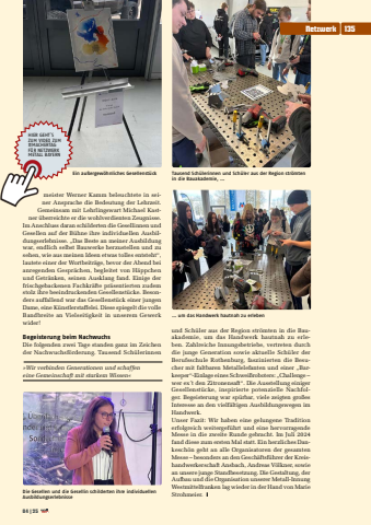 meister Werner Kamm beleuchtete in seiner Ansprache die Bedeutung der Lehrzeit. Gemeinsam mit Lehrlingswart Michael Kastner %u00fcberreichte er die wohlverdienten Zeugnisse. Im Anschluss daran schilderten die Gesellinnen und Gesellen auf der B%u00fchne ihre individuellen Ausbildungserlebnisse. %u201eDas Beste an meiner Ausbildung war, endlich selbst Bauwerke herzustellen und zu sehen, wie aus meinen Ideen etwas tolles entsteht%u201c, lautete einer der Wortbeitr%u00e4ge, bevor der Abend bei anregenden Gespr%u00e4chen, begleitet von H%u00e4ppchen und Getr%u00e4nken, seinen Ausklang fand. Einige der frischgebackenen Fachkr%u00e4fte pr%u00e4sentierten zudem stolz ihre beeindruckenden Gesellenst%u00fccke. Besonders auffallend war das Gesellenst%u00fcck einer jungen Dame, eine K%u00fcnstlerstaffelei. Diese spiegelt die volle Bandbreite an Vielseitigkeit in unserem Gewerk wider! Begeisterung beim NachwuchsDie folgenden zwei Tage standen ganz im Zeichen der Nachwuchsf%u00f6rderung. Tausend Sch%u00fclerinnen Ein au%u00dfergew%u00f6hnliches Gesellenst%u00fcckTausend Sch%u00fclerinnen und Sch%u00fcler aus der Region str%u00f6mten in die Bauakademie, %u2026 %u2026 um das Handwerk hautnah zu erlebenund Sch%u00fcler aus der Region str%u00f6mten in die Bauakademie, um das Handwerk hautnah zu erleben. Zahlreiche Innungsbetriebe, vertreten durch die junge Generation sowie aktuelle Sch%u00fcler der Berufsschule Rothenburg, faszinierten die Besucher mit faltbaren Metallelefanten und einer %u201eBarkeeper%u201c-Einlage eines Schwei%u00dfroboters: %u201eChallenge %u2013 wer ex%u00b4t den Zitronensaft%u201c. Die Ausstellung einiger Gesellenst%u00fccke, inspirierte potenzielle Nachfolger. Begeisterung war sp%u00fcrbar, viele zeigten gro%u00dfes Interesse an den vielf%u00e4ltigen Ausbildungswegen im Handwerk. Unser Fazit: Wir haben eine gelungene Tradition erfolgreich weitergef%u00fchrt und eine hervorragende Messe in die zweite Runde gebracht. Im Juli 2024 fand diese zum ersten Mal statt. Ein herzliches Dankesch%u00f6n geht an alle Organisatoren der gesamten Messe %u2013 besonders an den Gesch%u00e4ftsf%u00fchrer der Kreishandwerkerschaft Ansbach, Andreas V%u00f6lkner, sowie an unsere junge Standbesetzung. Die Gestaltung, der Aufbau und die Organisation unserer Metall-Innung Westmittelfranken lag wieder in der Hand von Marie Strohmeier. yDie Gesellen und die Gesellin schilderten ihre individuellen Ausbildungserlebnisse%u00bbWir verbinden Generationen und schaffen eine Gemeinschaft mit starkem Wissen%u00ab04|25Netzwerk135HIER GEHT%u00b4S ZUM VIDEO ZUM #MACHERTAG F%u00dcR NETZWERK METALL BAYERN