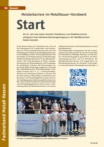 xxxFachverband Metall HessenMeisterkarriere im Metallbauer-HandwerkStartAm 26. Juni 2025 haben dreizehn Metallbauer und Metallbauerinnen erfolgreich ihren Meistervorbereitungslehrgang an der Metallfachschule Hessen beendet.Sechs Monate hatten die Teilnehmer Zeit, sich auf die Pr%u00fcfungsteile I-IV vorzubereiten. Der Stundenplan war voll mit pr%u00fcfungsrelevanten aber auch mit berufsbezogenen Themen, die Metallbaumeister sp%u00e4ter besch%u00e4ftigen werden. Normung/Richtlinien und die Vergabe und Vertragsordnung von Bauleistungen (VOB) sind gefragte Kenntnisse in den Metallbaubetrieben. Aber auch Kenntnisse in Statik, Auftragsabwicklung und Werkstoffkunde sind Grundlagen f%u00fcr erfolgreiches Arbeiten. Mit Fachvortr%u00e4gen von der Firma ZINQ Technologie GmbH und von Frank Pfau, Metallbaumeister, Schwei%u00dffachmann, Fachplaner Fassade und %u00f6. b. u. v. Sachverst%u00e4ndiger, erhielten die Teilnehmer Einblick in Themen, die f%u00fcr ihren sp%u00e4teren Arbeitsalltag von Relevanz sind. Kenntnisse und Handfertigkeiten konnten dann in der Anfertigung eines Meisterprojekts bewiesen werden. Aber auch die Fachtheorie in Betriebswirtschaft und Arbeitsp%u00e4dagogik kamen nicht zu kurz. Unterst%u00fctzung erhielt der Meisternachwuchs von unseren erfahrenen Dozenten und Fachspezialisten aus dem Metallhandwerk.Nach Bekanntgabe der Ergebnisse fiel die Anspannung bei den allen sp%u00fcrbar ab und die Freude %u00fcber die bestandenen Pr%u00fcfungen %u00fcberwog. In einer kleinen Verabschiedungsfeier gratulierten der Meisterpr%u00fcfungsausschuss und die Mitarbeiter der Metallfachschule Hessen den Jungmeistern im Metallbauerhandwerk. Im Anschluss wurde gefeiert und meisterhafte Zukunftspl%u00e4ne geschmiedet. yDie Meister im Metallbauer-Handwerk des ersten Halbjahres 2025 mit AusbildernFoto: Metallfachschule Hessen04|25136NetzwerkNetzwerk