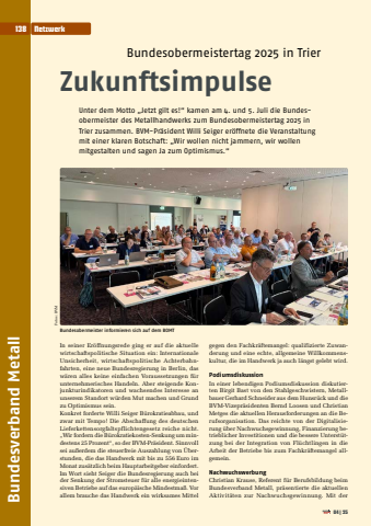 Bundesverband MetallBundesobermeistertag 2025 in TrierZukunftsimpulseUnter dem Motto %u201eJetzt gilt es!%u201c kamen am 4. und 5. Juli die Bundesobermeister des Metallhandwerks zum Bundesobermeistertag 2025 in Trier zusammen. BVM-Pr%u00e4sident Willi Seiger er%u00f6ffnete die Veranstaltung mit einer klaren Botschaft: %u201eWir wollen nicht jammern, wir wollen mitgestalten und sagen Ja zum Optimismus.%u201cIn seiner Er%u00f6ffnungsrede ging er auf die aktuelle wirtschaftspolitische Situation ein: Internationale Unsicherheit, wirtschaftspolitische Achterbahnfahrten, eine neue Bundesregierung in Berlin, das w%u00e4ren alles keine einfachen Voraussetzungen f%u00fcr unternehmerisches Handeln. Aber steigende Konjunkturindikatoren und wachsendes Interesse an unserem Standort w%u00fcrden Mut machen und Grund zu Optimismus sein.Konkret forderte Willi Seiger B%u00fcrokratieabbau, und zwar mit Tempo! Die Abschaffung des deutschen Lieferkettensorgfaltspflichtengesetz reiche nicht. %u201eWir fordern die B%u00fcrokratiekosten-Senkung um mindestens 25 Prozent%u201c, so der BVM-Pr%u00e4sident. Sinnvoll sei au%u00dferdem die steuerfreie Auszahlung von %u00dcberstunden, die das Handwerk mit bis zu 556 Euro im Monat zus%u00e4tzlich beim Hauptarbeitgeber einfordert. Im Wort sieht Seiger die Bundesregierung auch bei der Senkung der Stromsteuer f%u00fcr alle energieintensiven Betriebe auf das europ%u00e4ische Mindestma%u00df. Vor allem brauche das Handwerk ein wirksames Mittel gegen den Fachkr%u00e4ftemangel: qualifizierte Zuwanderung und eine echte, allgemeine Willkommenskultur, die im Handwerk ja auch l%u00e4ngst gelebt wird. PodiumsdiskussionIn einer lebendigen Podiumsdiskussion diskutierten Birgit Bast von den Stahlgeschwistern, Metallbauer Gerhard Schneider aus dem Hunsr%u00fcck und die BVM-Vizepr%u00e4sidenten Bernd Loosen und Christian Metges die aktuellen Herausforderungen an die Berufsorganisation. Das reichte von der Digitalisierung %u00fcber Nachwuchsgewinnung, Finanzierung betrieblicher Investitionen und die bessere Unterst%u00fctzung bei der Integration von Fl%u00fcchtlingen in die Arbeit der Betriebe bis zum Fachkr%u00e4ftemangel allgemein. Nachwuchswerbung Christian Krause, Referent f%u00fcr Berufsbildung beim Bundesverband Metall, pr%u00e4sentierte die aktuellen Aktivit%u00e4ten zur Nachwuchsgewinnung. Mit der Bundesobermeister informieren sich auf dem BOMTFotos: BVM04|25138Netzwerk