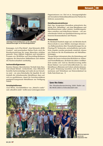 Kampagne %u201eLet%u2019s Play Metal%u201c, dem Netzwerk %u201eBOBConnect%u201c und praxisnahen Online-Tools wird die Berufsorientierung f%u00fcr junge Menschen erlebbar gemacht. Neue digitale Angebote und interaktive Formate wie VR-Brillen und Storytelling-Webinare erg%u00e4nzen die klassischen Ma%u00dfnahmen und st%u00e4rken die Nachwuchsarbeit nachhaltig.Sachverst%u00e4ndigenwesenKarsten Zimmer, Bereichsleiter Technik beim Bundesverband Metall, verdeutlichte, dass %u00f6ffentlich bestellte Sachverst%u00e4ndige weit mehr als nur Gutachter sind %u2013 sie seien Botschafter f%u00fcr Qualit%u00e4t. Er rief deshalb die teilnehmenden Metallbauer dazu auf, sich zu qualifizieren, damit f%u00fcr Gerichtsverfahren gen%u00fcgend kompetente Metallbauer zur Verf%u00fcgung stehen.VorteilsplattformenAxel W%u00f6lm, Gesch%u00e4ftsf%u00fchrer von %u201eMetall & mehr%u201c und %u201eBenefit & mehr%u201c stellte neue Leistungen seiner Organisationen vor. Ziel sei es, Innungsmitglieder mit besonderen Einkaufskonditionen bei Partner-Zulieferern auszustatten.MetallbaukonstruktionenDipl.-Ing. Jeyagumaar Nisanthan pr%u00e4sentierte das Statik-Tool %u201eMetallStat%u201c, mit dem Metallbauer und Metallbauerinnen selbst pr%u00e4zise Ausf%u00fchrungsstatiken erstellen und diskutieren k%u00f6nnen %u2013 ein entscheidender Schritt zur Qualit%u00e4tssicherung und zur besseren Kommunikation mit Planern.PhotovoltaikDr. Reinhard Fandrich zeigte auf, wie Betriebe durch Photovoltaik in neue M%u00e4rkte einsteigen k%u00f6nnen %u2013 von Balkonmodulen %u00fcber Fassadenl%u00f6sungen bis zu Floating-PV. Technische, wirtschaftliche und rechtliche Aspekte wurden praxisnah vermittelt, ebenso wie Chancen f%u00fcr die Kombination mit Metallbauleistungen.Thomas R%u00f6per informierte %u00fcber die Entstehung und Inhalte der neuen technischen Richtlinie zu Anbauund Vorstellbalkonen, die Ende des Jahres ver%u00f6ffentlicht werden soll. Und im Abschlussvortrag stellte Bernd Dalmer von Lorch Schwei%u00dftechnik vor, wie Metallbauer effizienter mit Cobots arbeiten k%u00f6nnen. Bei guter Stimmung tauschten sich die Teilnehmerinnen und Teilnehmer am Netzwerkabend im Nells Park Hotel aus. yLebendige Podiumsdiskussion zu den aktuellen Herausforderungen an die BerufsorganisationRahmenprogramm durch das historische TrierSave the Date: Der Bundesobermeistertag 2026 findet am 08./09.05.2026 in Schwalmstadt statt.04|25Netzwerk139