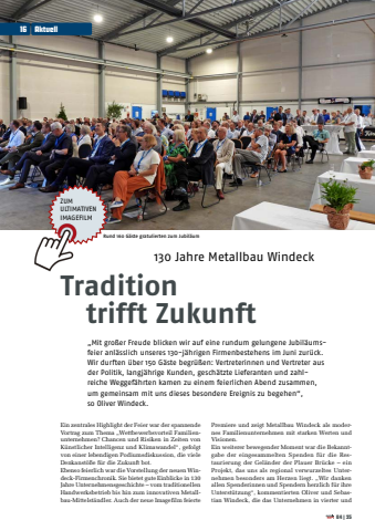 Ein zentrales Highlight der Feier war der spannende Vortrag zum Thema %u201eWettbewerbsvorteil Familienunternehmen? Chancen und Risiken in Zeiten von K%u00fcnstlicher Intelligenz und Klimawandel%u201c, gefolgt von einer lebendigen Podiumsdiskussion, die viele Denkanst%u00f6%u00dfe f%u00fcr die Zukunft bot.Ebenso feierlich war die Vorstellung der neuen Windeck-Firmenchronik. Sie bietet gute Einblicke in 130 Jahre Unternehmensgeschichte %u2013 vom traditionellen Handwerksbetrieb bis hin zum innovativen Metallbau-Mittelst%u00e4ndler. Auch der neue Imagefilm feierte Premiere und zeigt Metallbau Windeck als modernes Familienunternehmen mit starken Werten und Visionen. Ein weiterer bewegender Moment war die Bekanntgabe der eingesammelten Spenden f%u00fcr die Restaurierung der Gel%u00e4nder der Plauer Br%u00fccke %u2013 ein Projekt, das uns als regional verwurzeltes Unternehmen besonders am Herzen liegt. %u201eWir danken allen Spenderinnen und Spendern herzlich f%u00fcr ihre Unterst%u00fctzung%u201c, kommentierten Oliver und Sebastian Windeck, die das Unternehmen in vierter und Rund 160 G%u00e4ste gratulierten zum Jubil%u00e4um130 Jahre Metallbau WindeckTradition trifft Zukunft%u201eMit gro%u00dfer Freude blicken wir auf eine rundum gelungene Jubil%u00e4umsfeier anl%u00e4sslich unseres 130-j%u00e4hrigen Firmenbestehens im Juni zur%u00fcck. Wir durften %u00fcber 150 G%u00e4ste begr%u00fc%u00dfen: Vertreterinnen und Vertreter aus der Politik, langj%u00e4hrige Kunden, gesch%u00e4tzte Lieferanten und zahlreiche Weggef%u00e4hrten kamen zu einem feierlichen Abend zusammen, um gemeinsam mit uns dieses besondere Ereignis zu begehen%u201c, so Oliver Windeck.ZUM ULTIMATIVENIMAGEFILM16Aktuell04|25