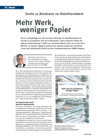 Studie zu B%u00fcrokratie im Metallhandwerk Mehr Werk, weniger Papier Rund 75 Arbeitstage pro Jahr verlieren Betriebe im Metallhandwerk im Schnitt an produktiver Zeit durch B%u00fcrokratie. Hinzu kommen Kosten f%u00fcr externe Unterst%u00fctzung in H%u00f6he von durchschnittlich mehr als 20.000 Euro j%u00e4hrlich. Zu diesem Ergebnis kommt eine aktuelle Studie der Fachhochschule des Mittelstands (FHM) und der Handwerkskammer (HWK) Dresden.Wie viele b%u00fcrokratische Pflichten ein typischer Metallhandwerksbetrieb mit f%u00fcnf bis f%u00fcnfzehn Mitarbeiterinnen und Mitarbeitern zu erf%u00fcllen hat, wo die gr%u00f6%u00dften Belastungen entstehen und wie sich der Aufwand f%u00fcr Betriebe reduzieren l%u00e4sst, sind die Fragen, mit denen sich die Fachhochschule des Mittelstands und die Handwerkskammer Dresden in ihrem gemeinsamen Projekt %u201eMehr Werk, weniger Papier%u201c besch%u00e4ftigen, um die B%u00fcrokratiebelastung im Metallhandwerk zu ermitteln und konkrete Vorschl%u00e4ge zur Entlastung der Unternehmen zu erarbeiten. Denn wie gro%u00df die b%u00fcrokratische Belastung f%u00fcr einen Betrieb dieser Gr%u00f6%u00dfenordnung tats%u00e4chlich insgesamt ist, war vor Projektbeginn allen Beteiligten %u2013 auch den Betrieben selbst %u2013 unklar.Das Ergebnis %u00fcberraschtselbst die StudienmacherAm Ende identifiziert die Studie insgesamt 102 wiederkehrende b%u00fcrokratische Pflichten, die Handwerksbetriebe regelm%u00e4%u00dfig erf%u00fcllen m%u00fcssen %u2013 von Arbeitgeberpflichten, allgemeinen Unternehmenspflichten bis zu gewerkspezifischen Pflichten. Das f%u00fchrt zu rund 75 Arbeitstagen und Kosten in H%u00f6he von mehr als 20.000 Euro pro Jahr mehr.%u201eDas Ergebnis hat selbst uns, die wir um den hohen b%u00fcrokratischen Aufwand f%u00fcr die Wirtschaft wissen, %u00fcberrascht%u201c, so Kammerpr%u00e4sident J%u00f6rg Dittrich und Hauptgesch%u00e4ftsf%u00fchrer Dr. Andreas Brzezinski. %u201eEs verdeutlicht anschaulich, wie hoch die gesetzlich vorgeschriebenen Anforderungen an Unternehmen des Handwerks inzwischen geworden sind. Diese b%u00fcrokratischen Zw%u00e4nge belasten die wirtschaftliche Leistungskraft der Betriebe erheblich und erschweren die Zukunftsf%u00e4higkeit des gesamten Handwerks.%u201c Auch die im Bericht nachzulesenden Aussagen betroffener Unternehmer veranschaulichten das deutlich: %u201eHier herrscht dringender Ver%u00e4nderungsbedarf, wenn wir die Wirtschaft in unserem Land wieder zum Laufen bringen wollen.%u201c %u00bbB%u00fcrokratie darf nicht zur Innovationsbremse werden%u00ab, betont Prof. Dr. Volker Wittberg, Prorektor f%u00fcr Forschung und Internationales an der FHMDie gesamte Studie finden Sie hier: https://fh-mittelstand.aflip.in/b%u00fcrokratiebelastung_im_handwerk.html22Aktuell04|25