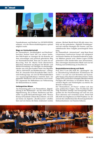 Fassadenbauers und Heribert Ley (SUNOVATION) erl%u00e4utert, wie die Photovoltaikintegration optimal m%u00f6glich wurde.Wege zur KreislaufwirtschaftIm Themenblock %u201eNachhaltigkeit und Resilienz%u201c berichtet Norbert Sack (ift) von einem laufenden F&E-Projekt zu L%u00f6sungen f%u00fcr die Branche auf dem notwendigen und politisch geforderten Weg zur Kreislaufwirtschaft, denn das ist mehr als nur Recycling. Prof. Dr. Martin Teich (Hochschule M%u00fcnchen) informiert am Beispiel der Wieder- und Weiterverwendung von Flachglas aus Bestandsgeb%u00e4uden was sich ganz konkret hinter den Begriffen %u201eReUse, ReFurbish und ReManufacture%u201c verbirgt. Prof. Dr. Alexander Stolz (Fraunhofer EMI, Universit%u00e4t Freiburg) zeigt, wie sich die Wirtschaftlichkeit von Anpassungsma%u00dfnahmen ermitteln l%u00e4sst, um gegen%u00fcber Bauherren und Investoren auch monet%u00e4re Argumente f%u00fcr Ma%u00dfnahmen zur Verbesserung der Klimaresilienz zu nutzen.Umfangreiches WissenAm Donnerstag geht es im Themenblock %u201eDigitalisierung in der Baubranche%u201c um das weite Feld der Digitalisierung, die ja Planer, Bauherren und Hersteller vor gro%u00dfe Herausforderungen stellt. Thomas Kirmayr (Fraunhofer-Allianz Bau) erl%u00e4utert, wie sich am besten ein digitales %u201eBau%u00f6kosystem%u201c schaffen l%u00e4sst und wie hierzu die Daten strukturiert werden m%u00fcssen. Michael Breckl-Stock (ift) gibt einen Ausblick auf den geforderten %u201eDigitalen Produktpass%u201c und mit welchen Strategien die Fenster- und Fassadenbranche diese Aufgabe praxistauglich l%u00f6sen kann.Im Themenblock %u201eInternational%u201c zeigt Rami Bon%u00e9 (Aluminium Construction Group) wie erfolgreich und kreativ Bambus als Fassadenwerkstoff in anderen M%u00e4rkten genutzt wird. Hubert Lagier (CSTB) pr%u00e4sentiert echte Insider-Infos zum interessanten, aber schwierigen franz%u00f6sischen Markt und was bei Pr%u00fcfung und Zertifizierung zu beachten ist.Bauproduktenverordnung und MarktProf. J%u00f6rn P. Lass (ift) stellt die %u201eSpielregeln%u201c der in %u00dcberarbeitung befindlichen Produktnorm EN 14351-1 vor und wie sich Hersteller und Systemgeber heute schon darauf vorbereiten k%u00f6nnen. Frank Lange (VFF) und Jochen Gr%u00f6negr%u00e4s (Bundesverband Flachglas BF) berichten in bew%u00e4hrter Weise, mit welchen Regeln und F%u00f6rdert%u00f6pfen aus Berlin die Branche rechnen kann.Der Themenblock %u201eift Praxis%u201c widmet sich den ganz praktischen Fragen. Felix Fischbacher (ift) zeigt detailliert h%u00e4ufige und kostspielige Fehlerquellen bei der Fenstermontage auf und wie sich diese erkennen und vermeiden lassen. Bernd Sa%u00df (ift) stellt neue Ergebnisse aus F&E-Projekten vor, die sich mit der schalltechnischen Bewertung kritischer Einbausituationen von Fenstern befassen.30Aktuell04|25
