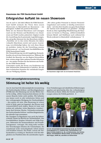 Hausmesse der FOM Deutschland GmbH Erfolgreicher Auftakt im neuen ShowroomAm 10. und 11. Juli 2025 %u00f6ffnete die FOM Deutschland GmbH erstmals die T%u00fcren ihres neuen Showrooms in Marienfeld zur Hausmesse %u2013 ein gelungener Auftakt mit positiver Resonanz.Mehr als ein Dutzend Maschinen und L%u00f6sungen rund um das Trennen und Bearbeiten von Aluminium und Stahl wurden pr%u00e4sentiert. Erg%u00e4nzt wurde die Ausstellung durch praxisnahe Logistikl%u00f6sungen, die auf gro%u00dfes Interesse bei den Besuchern stie%u00dfen.%u201eNachdem wir in den ersten Monaten des Jahres verkaufte Maschinen ersetzt und unsere Ausstattung vervollst%u00e4ndigt haben, bot sich diese Messe als perfekter Anlass f%u00fcr die Vorstellung unseres Showrooms an%u201c, so Uwe Kosok, Gesch%u00e4ftsf%u00fchrer der FOM Deutschland GmbH.Die Veranstaltung zog sowohl langj%u00e4hrige Bestandskunden als auch neue Interessenten an. W%u00e4hrend der Gro%u00dfteil der Besucher aus der Region Ostwestfalen kam, reisten einige G%u00e4ste mehrere hundert Kilometer an %u2013 ein starkes Zeichen f%u00fcr das Interesse am Portfolio der FOM Deutschland.Unterst%u00fctzt wurde das Event von Fachleuten aus dem italienischen Stammwerk in Cattolica, die mit ihrer technischen Expertise f%u00fcr vertiefende Gespr%u00e4che zur Verf%u00fcgung standen.%u201eWir sehen gro%u00dfes Potenzial in diesem Veranstaltungsformat und werden es k%u00fcnftig weiterentwickeln %u2013 mit dem Ziel, Kunden aus ganz Deutschland die Anreise noch attraktiver zu gestalten%u201c, k%u00fcndigt Kosok an. Eine regelm%u00e4%u00dfige Wiederholung der Hausmesse ist bereits in Planung. %u201eSelbstverst%u00e4ndlich k%u00f6nnen Metall- und Stahlbauer auch w%u00e4hrend der Woche jederzeit in Marienfeld vorbeikommen.%u201c yFVSB-JahresmitgliederversammlungStimmung ist heiter bis wolkigAm 24. Juni fand die Jahresmitgliederversammlung des Fachverbandes Schloss- und Beschlagindustrie (FVSB) statt. Die Stimmung war wie das Wetter: heiter bis wolkig. %u201eEitlen Sonnenschein k%u00f6nnen wir f%u00fcr unsere Branche leider nicht melden. Wir befinden uns immer noch in sehr turbulenten Zeiten und den vorhergesagten R%u00fcckgang der Neubaut%u00e4tigkeit %u2013 den sp%u00fcren wir jetzt. Eine Besserung ist vorerst nicht in Sicht, ganz im Gegenteil, das Niveau wird voraussichtlich noch sinken. Bauen ist teuer und zudem mit unfassbar vielen Regularien versehen%u201c, fasste Karl Kristian Woelm, Vorstandsvorsitzender des Fachverbandes Schloss- und Beschlagindustrie, die aktuelle Lage zusammen.Die Zunahme an Regularien war auch das beherrschende Thema im Bericht zur Verbandsarbeit, den Gesch%u00e4ftsf%u00fchrer Stephan Schmidt und Silke Koppers, Referentin f%u00fcr Kommunikation und Projektmanagement, vortrugen. Die stetig mehr werdenden Verordnungen belasten die Unternehmen, die zunehmend nicht wertsch%u00f6pfende Arbeit leisten und bezahlen m%u00fcssen. Ein Punkt, warum die Verbandsarbeit so wichtig ist. Hierdurch wird den Mitgliedern ein %u00dcberblick %u00fcber die anstehenden regulativen Ver%u00e4nderungen mit inhaltlichen Erl%u00e4uterungen gegeben und gleichzeitig %u00fcber das verbandseigene Netzwerk an einem Abbau der Gesetze und Verordnungen seitens der Politik gearbeitet. yFoto: FVSBAuf der Jahresmitgliederversammlung wurde der Vorstand wiedergew%u00e4hlt (v.l.): Matthias Kohl, Gesch%u00e4ftsf%u00fchrer von Beyer & M%u00fcller GmbH & Co. KG, als Stellvertreter, Karl Kristian Woelm, Gesch%u00e4ftsf%u00fchrer Woelm GmbH, als Vorsitzender und Wolf Hoppe, HOPPE AG, ebenfalls als StellvertreterDie Hausmesse zeigte mehr als ein Dutzend MaschinenFoto: FOMAktuell3304|25