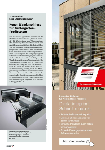 TS Aluminium: Serie %u201eVeranda Exclusiv%u201c Neuer Wandanschluss f%u00fcr WintergartenProfilsystem Neu mit einer Kippschiene versehen ist der Wandanschluss der Serie %u201eVeranda Exclusiv%u201c f%u00fcr Winterg%u00e4rten von TS Aluminium. Der zweiteilige Wandanschluss ist in vier Ausf%u00fchrungen erh%u00e4ltlich: f%u00fcr Tr%u00e4gerh%u00f6hen von 115 oder 155 Millimetern bei Dachneigungen von 0 bis 25 Grad oder ab 25 bis 45 Grad. Damit entfallen die bislang erforderlichen Anpassungen in der Fertigung aufgrund unterschiedlicher Dachneigungen oder Glasst%u00e4rken. F%u00fcr den Anschluss der Tr%u00e4ger an die Wand dienen die neuen Verbinder-Sets. Die Verglasungsdichtungen sind in Tr%u00e4gern und Gelenkprofil integriert und das Endst%u00fcck, %u00fcber das auch die kontrollierte Kondensat-Entw%u00e4sserung erfolgt, wird mit Moosgummi abgedichtet, was zusammen zu einem dichteren Gesamtaufbau f%u00fchrt. Identische umlaufende Glasleisten sorgen schlie%u00dflich f%u00fcr eine elegantere Optik. Das vorherige System bleibt verf%u00fcgbar, ist jedoch nicht mehr im Katalog gelistet. yDie neue Kippschiene bietet am Wandanschluss flexible M%u00f6glichkeiten f%u00fcr Dachneigung und Glasst%u00e4rke %u2013 inklusive optimaler Abdichtung und OptikFoto: TS Aluminium04|25