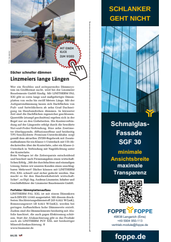 D%u00e4cher schneller d%u00e4mmenLinzmeiers lange L%u00e4ngenWer ein flexibles und zeitsparendes D%u00e4mmsystem im Gro%u00dfformat sucht, wird bei der Linzmeier Bauelemente GmbH f%u00fcndig. Mit LINITHERM PAL XXl gibt es extra lange und ma%u00dfgefertigte D%u00e4mmplatten von sechs bis zw%u00f6lf Metern L%u00e4nge. Mit der Aufsparrend%u00e4mmung lassen sich Dachfl%u00e4chen von Pult- und Satteld%u00e4chern ab zehn Grad Dachneigung im Handumdrehen d%u00e4mmen. In k%u00fcrzester Zeit sind die Dachfl%u00e4chen regensicher geschlossen. Querst%u00f6%u00dfe (stumpf geschnitten) ergeben sich in der Regel nur an den Giebelseiten. Die Kantenverbindung auf der L%u00e4ngsseite erfolgt durch die bew%u00e4hrte Nut-und-Feder-Verbindung. Eine zehn Zentimeter %u00fcberlappende, diffusionsoffene und beidseitig TPU-beschichtete Premium-Unterdeckbahn sorgt gem%u00e4%u00df dem aktuellen ZVDH-Regelwerk mit Zusatzma%u00dfnahmen f%u00fcr ein Klasse-1-Unterdach mit UD-Abdeckstreifen %u00fcber der Konterlatte, oder ein Klasse-2- Unterdach in Verbindung mit Nageldichtung unter der Konterlatte.Beim Verlegen ist die Zeitersparnis entscheidend und beschert nach Firmenangaben einen wirtschaftlichen Erfolg. %u201eMit der durchdachten und einmaligen L%u00f6sung, bieten wir unseren Kunden einen unschlagbaren Mehrwert! D%u00e4cher k%u00f6nnen mit LINITHERM PAL XXL schnell und sicher gedeckt werden. Das macht es f%u00fcr den Handwerksbetrieb wirtschaftlicher%u201c, so Dipl.-Ing. Andreas Linzmeier, Inhaber und Gesch%u00e4ftsf%u00fchrer der Linzmeier Bauelemente GmbH. Perfekter D%u00e4mmplattenaufbauLINITHERM PAL XXL ist mit einem D%u00e4mmkern nach DIN EN 13165 ausgestattet. Mit diesem druckfesten Hochleistungsd%u00e4mmstoff (%u03bbD 0,022 W/(mK), Bemessungswert %u03bbB 0,023 W/(mK)), werden bei geringen Aufbauh%u00f6hen hohe D%u00e4mmwerte erzielt. Zudem sind die D%u00e4mmelemente beidseitig mit Alufolie kaschiert, die auch gegen Elektrosmog sch%u00fctzen. Statt der Alukaschierung gibt es das Produkt auch als LINITHERM PGV XXL mit beidseitiger Mineralvlieskaschierung. ywww.linzmeier.deMIT EINEM KLICK ZUM VIDEOFoto: LinzmeierSchmalglasFassadeSGF30foppe.de49838Lengerich(Ems)+495904950-113vertrieb.module@foppe.deSCHLANKERGEHTNICHTminimaleAnsichtsbreitemaximaleTransparenz04|25