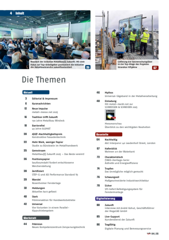 Die ThemenAktuell3Editorial & Impressum6Kurznachrichten12Neue Impulsemetall-messe.net 202516Tradition trifft Zukunft130 Jahre Metallbau Windeck18Barrierefrei45 Jahre ALUMAT20A|U|F-NachhaltigkeitspreisKonstruktive Fassadentechnik22Mehr Werk, weniger Papier Studie zu B%u00fcrokratie im Metallhandwerk 25GemeinsamMetallbau[t] Zukunft 2025 %u2013 Das Beste vereint!26Positionspapier bauforumstahl fordert entschlossene Weichenstellung28ZertifiziertSTEP-G und ASI Performance Standard V329WandelRosenheimer Fenstertage32MeldungenAktuelles kurz gefasst40StarkPr%u00e4mienaktion f%u00fcr Handwerksbetriebe 42UniversalVier Varianten in einem Parallel-KippschiebesystemWerkstatt44Pr%u00e4zisionNeues Kompetenzzentrum Zerspanungstechnik46MythosUniversal-S%u00e4geband in der Metallverarbeitung48EinladungMit metall-markt.net zur SCHWEISSEN & SCHNEIDEN 2025Messevorschau%u00dcberblick zu den wichtigsten NeuheitenBaustelle64NachhaltigAGC Interpane: 40 Leadenhall Street, London67HafenblickWohnen an der Waterkant72CharakteristischFINEO-Heritage-Serie: %u00c4sthetik und Energieeffizienz74TropfenDas Unm%u00f6gliche m%u00f6glich gemacht76SchwungvollMa%u00dfgeschneiderte Industriearchitektur78SicherSFS liefert Befestigungssystem f%u00fcr FenstermontageDigitalisierung80ZukunftInterview mit Andr%u00e9 Kohut, Gesch%u00e4ftsf%u00fchrer der MegaCAD GmbH85Live-SupportKundendienst der Zukunft86Tragf%u00e4higDigitale Planung und BemessungsserviceNeustart der Initiative Metallbau[t] Zukunft: Mit demFokus auf Top-Arbeitgeber positioniert die Initiative die Metallbaubranche zukunftsorientiert25Lieferung der Sonnenschutzgl%u00e4ser in der Top-Etage des Projektes Strandkai FiftyNine67404|25Inhalt