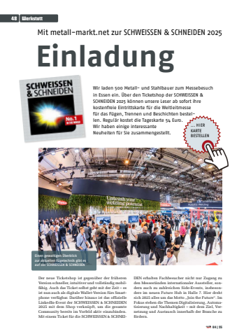 48Werkstatt04|25Mit metall-markt.net zur SCHWEISSEN & SCHNEIDEN 2025EinladungWir laden 500 Metall- und Stahlbauer zum Messebesuch in Essen ein. %u00dcber den Ticketshop der SCHWEISSEN & SCHNEIDEN 2025 k%u00f6nnen unsere Leser ab sofort ihre kostenfreie Eintrittskarte f%u00fcr die Weltleitmesse f%u00fcr das F%u00fcgen, Trennen und Beschichten bestellen. Regul%u00e4r kostet die Tageskarte 54 Euro. Wir haben einige interessante Neuheiten f%u00fcr Sie zusammengestellt.Der neue Ticketshop ist gegen%u00fcber der fr%u00fcheren Version schneller, intuitiver und vollst%u00e4ndig mobilf%u00e4hig. Auch das Ticket selbst geht mit der Zeit %u2013 es ist nun auch als digitale Wallet-Version f%u00fcrs Smartphone verf%u00fcgbar. Dar%u00fcber hinaus ist das offizielle LinkedIn-Event der SCHWEISSEN & SCHNEIDEN 2025 mit dem Shop verkn%u00fcpft, um die gesamteCommunity bereits im Vorfeld aktiv einzubinden.Mit einem Ticket f%u00fcr die SCHWEISSEN & SCHNEIDEN erhalten Fachbesucher nicht nur Zugang zu den Messest%u00e4nden internationaler Aussteller, sondern auch zu zahlreichen Side-Events, insbesondere im neuen Future Hub in Halle 7. Hier dreht sich 2025 alles um das Motto %u201eJoin the Future%u201c. Im Fokus stehen die Themen Digitalisierung, Automatisierung und Nachhaltigkeit %u2013 mit dem Ziel, Vernetzung und Austausch innerhalb der Branche zu f%u00f6rdern.Einen gewaltigen %u00dcberblick zur aktuellen F%u00fcgetechnik gibt es auf der SCHWEISSEN & SCHNEIDEN... HIERKARTE BESTELLEN