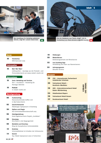 VERBAND UND INNUNGForum88TrendschauEMO Hannover 2025Lieferquellen90Wer? Wo? Was?Lieferquellen %u2013 Ausz%u00fcge aus der Produkt- undFirmendatenbank von www.metall-markt.netUnternehmen95Serie: Marketing und ServicesTeil I: Durchblick %u2013 Marketing f%u00fcr Montage-Betriebe99Podcastin metall-markt.netMetallgestaltung100FunkenschlagMuseumsschmiede treffen sichin Bad Sobernheim102GeschichtsstundeMetallurgie-Symposium in Eisenberg104Mythen und MagieDie Schmiedeweltmeisterschaft 2025106MetallgestaltungErste Ergebnisse beim Projekt %u201eIronNotes%u201c108KreuzwegEine Reise in die Vergangenheit109R%u00fcckblick und VorschauRing der Europ%u00e4ischen Schmiedest%u00e4dte112Einblicke Schmiedefestival im Schatten der Schlossruine114VereintTop-Metall-Symposium 2025 in Tschechien118Meldungen120WetterfahnenBedeutungsverlust und Renaissance122Iron Smelting DaysHerstellung von Eisen aus Raseneisenerz124JahresprogrammAktuelle TermineNetzwerk126IFGS - Internationaler Fachverband Gestaltender Schmiede128Fachverband Metall %u2013 Nordrhein-Westfalen130UVM - Unternehmerverband MetallBaden-W%u00fcrttemberg134Metallverband Bayern136Fachverband Metall Hessen137Bundesverband MetallEine der Skulpturen zum Thema %u201eEngel%u201d, die im Krankenhaus von Mlada Boleslav aufgestellt wurdenWie Metallbauer ihr Marketing optimieren k%u00f6nnen, zeigt Teil 1 unserer neuen Serie95116Das f%u00fcnfte Jungschmiedetreffen im Jahr 2024 in Kolbermoor stand unter dem Motto %u201eSchrift, Zahlen und Zeichen%u201c126Inhalt504|25