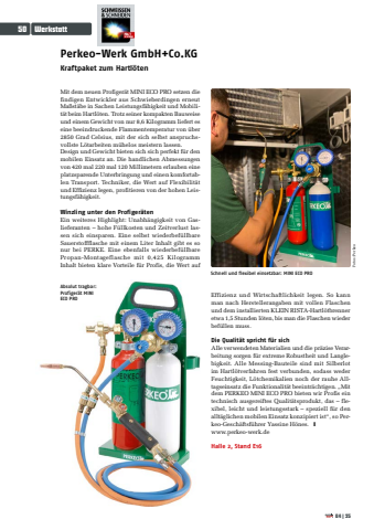 Mit dem neuen Profiger%u00e4t MINI ECO PRO setzen die findigen Entwickler aus Schwieberdingen erneut Ma%u00dfst%u00e4be in Sachen Leistungsf%u00e4higkeit und Mobilit%u00e4t beim Hartl%u00f6ten. Trotz seiner kompakten Bauweise und einem Gewicht von nur 8,6 Kilogramm liefert es eine beeindruckende Flammentemperatur von %u00fcber 2850 Grad Celsius, mit der sich selbst anspruchsvollste L%u00f6tarbeiten m%u00fchelos meistern lassen.Design und Gewicht bieten sich sich perfekt f%u00fcr den mobilen Einsatz an. Die handlichen Abmessungen von 420 mal 220 mal 120 Millimetern erlauben eine platzsparende Unterbringung und einen komfortablen Transport. Techniker, die Wert auf Flexibilit%u00e4t und Effizienz legen, profitieren von der hohen Leistungsf%u00e4higkeit.Winzling unter den Profiger%u00e4tenEin weiteres Highlight: Unabh%u00e4ngigkeit von Gaslieferanten %u2013 hohe F%u00fcllkosten und Zeitverlust lassen sich einsparen. Eine selbst wiederbef%u00fcllbare Sauerstoffflasche mit einem Liter Inhalt gibt es so nur bei PERKE. Eine ebenfalls wiederbef%u00fcllbare Propan-Montageflasche mit 0,425 Kilogramm Inhalt bieten klare Vorteile f%u00fcr Profis, die Wert auf Perkeo-Werk GmbH+Co.KGKraftpaket zum Hartl%u00f6tenEffizienz und Wirtschaftlichkeit legen. So kann man nach Herstellerangaben mit vollen Flaschen und dem installierten KLEIN RISTA-Hartl%u00f6tbrenner etwa 1,5 Stunden l%u00f6ten, bis man die Flaschen wieder bef%u00fcllen muss.Die Qualit%u00e4t spricht f%u00fcr sichAlle verwendeten Materialien und die pr%u00e4zise Verarbeitung sorgen f%u00fcr extreme Robustheit und Langlebigkeit. Alle Messing-Bauteile sind mit Silberlot im Hartl%u00f6tverfahren fest verbunden, sodass weder Feuchtigkeit, L%u00f6tchemikalien noch der rauhe Alltagseinsatz die Funktionalit%u00e4t beeintr%u00e4chtigen. %u201eMit dem PERKEO MINI ECO PRO bieten wir Profis ein technisch ausgereiftes Qualit%u00e4tsprodukt, das %u2013 flexibel, leicht und leistungsstark %u2013 speziell f%u00fcr den allt%u00e4glichen mobilen Einsatz konzipiert ist%u201c, so Perkeo-Gesch%u00e4ftsf%u00fchrer Yassine H%u00f6nes. ywww.perkeo-werk.deHalle 2, Stand E16Absolut tragbar: Profiger%u00e4t MINI ECO PROSchnell und flexibel einsetzbar: MINI ECO PRO50Werkstatt04|25Fotos: Perkeo