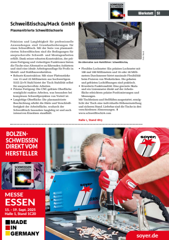 Schwei%u00dftisch24/Mack GmbHPlasmanitrierte Schwei%u00dftischserie Pr%u00e4zision und Langlebigkeit f%u00fcr professionelle Anwendungen sind Grundanforderungen f%u00fcr einen Schwei%u00dftisch. Mit der Serie von plasmanitrierten Schwei%u00dftischen sind die Bedingungen f%u00fcr anspruchsvolle Schwei%u00df- und Montagearbeiten erf%u00fcllt. Dank seiner robusten Konstruktion, der pr%u00e4zisen Fertigung und vielseitigen Funktionen bieten die Tische eine Alternative zu f%u00fchrenden Anbietern und sind eine ideale Arbeitsgrundlage f%u00fcr Profis in Metall- und Stahlbauwerkst%u00e4tten.%u2022Robuste Konstruktion: Mit einer Plattenst%u00e4rke von 15 und 25 Millimetern aus hochwertigem S355 J2+N Stahl bietet der Tisch Stabilit%u00e4t selbst f%u00fcr anspruchsvollste Arbeiten.%u2022Pr%u00e4zise Fertigung: Die CNC-gefr%u00e4ste Oberfl%u00e4che erm%u00f6glicht exaktes Arbeiten, was besonders bei komplexen Schwei%u00dfprojekten von Vorteil ist.%u2022Langlebige Oberfl%u00e4che: Die plasmanitrierte Beschichtung erh%u00f6ht die H%u00e4rte und Verschlei%u00dffestigkeit der Arbeitsfl%u00e4che, wodurch der Schwei%u00dftisch besonders langlebig ist und auch intensiven Eins%u00e4tzen standh%u00e4lt.%u2022Flexibles Lochraster: Ein pr%u00e4zises Lochraster mit 100 mal 100 Millimetern und 16 oder 28 Millimetern Durchmesser bietet maximale Flexibilit%u00e4t beim Fixieren von Werkst%u00fccken. Die gefasten und gefr%u00e4sten Loch%u00f6ffnungen sind praktisch.%u2022Erweiterte Funktionalit%u00e4t: Eine gravierte Skala und ein Linienraster direkt auf der Arbeitsfl%u00e4che erleichtern pr%u00e4zise Positionierungen und Messungen.Mit Tischbeinen und Stellf%u00fc%u00dfen ausgestattet, erm%u00f6glicht der Tisch eine individuelle H%u00f6heneinstellung und sicheren Stand. Lieferbar sind die Tische in drei verschiedenen Abmessungen. ywww.schwei%u00dftisch24.comHalle 1, Stand 1D13Die Alternative zum Marktf%u00fchrer: Schwei%u00dftisch24Foto: Mack15. - 19. Sept. 2025Halle 1, Stand 1C20MESSEESSENMADEINGERMANYBOLZENDIREKT VOMHERSTELLERSCHWEISSENsoyer.deWerkstatt51