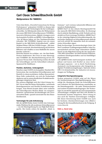 52Werkstatt04|25Carl Cloos Schwei%u00dftechnik GmbH Weltpremiere f%u00fcr TANDEM+ Unter dem Motto %u201ePowerful Connections for Strong Performances%u201c pr%u00e4sentiert CLOOS in diesem Jahr zukunftsweisende Technologien f%u00fcr das Lichtbogenschwei%u00dfen. Im Mittelpunkt stehen die Weltpremiere des neuen MIG/MAG-Schwei%u00dfprozesses TANDEM+, innovative Robotersysteme, digitale L%u00f6sungen sowie das komplette Portfolio an QINEO- Schwei%u00dfger%u00e4ten.%u201eVor 30 Jahren haben wir das Tandemschwei%u00dfen erfunden. Mit TANDEM+ beginnt nun ein neues Kapitel in der MIG/MAG-Schwei%u00dftechnik%u201c, erkl%u00e4rt Stephan Pittner, CEO der CLOOS-Gruppe. %u201eWir kombinieren maximale Abschmelzleistung mit h%u00f6chster Effizienz und schaffen so neue Ma%u00dfst%u00e4be f%u00fcr unsere Kunden weltweit.%u201cBesucher k%u00f6nnen live erleben, wie der Drei-DrahtProzess funktioniert. Bei Cloos ist man %u00fcberzeugt, dass TANDEM+ die Abschmelzleistung auf ein v%u00f6llig neues Niveau hebt. Gleichzeitig werden die Zahl der Schwei%u00dflagen und die Schwei%u00dfzeit reduziert. Spannend f%u00fcr Stahlbauer.Flexibel, skalierbar, leistungsstarkDaneben zeigt CLOOS ein kompaktes Standard-Robotersystem, das verschiedene Schwei%u00dfprozesse und Bauteile in einem modularen Aufbau demonstriert. Diese Zelle verdeutlicht, wie sich die Technologie skalieren und in unterschiedlichste Produktionsumgebungen integrieren l%u00e4sst.Ein weiteres Highlight wird die Cobot-L%u00f6sung ArcBoT. Sie ist ideal f%u00fcr kleine St%u00fcckzahlen, variierende Bauteilgeometrien und flexible Produktionsumgebungen. Zum Einsatz kommt dabei unter anderem der Schwei%u00dfprozess MoTion Weld: ein energiereduzierter, spritzerarmer Kurzlichtbogen mit reversierendem Draht, speziell entwickelt f%u00fcr den D%u00fcnnblechbereich.Technologie f%u00fcr jede AnforderungMit der QINEO-Reihe bietet CLOOS eine leistungsstarke Plattform f%u00fcr alle modernen Schwei%u00dfprozesse %u2013 von der Einstiegsl%u00f6sung bis zur High-End-Stromquelle. Die Ger%u00e4te stehen f%u00fcr Qualit%u00e4t %u201eMade in Germany%u201c und vereinen industrielle Effizienz mit intuitiver Bedienbarkeit.QINEO StarT ist das robuste Einstiegsmodell f%u00fcr das manuelle MIG/MAG-Schwei%u00dfen. Es %u00fcberzeugt durch einfache Handhabung, solide Technik und ein attraktives Preis-Leistungs-Verh%u00e4ltnis. QINEO NexT ist die vielseitige Hightech-Schwei%u00dfstromquelle, die ein breites Spektrum an Schwei%u00dfprozessen abdeckt und sich sowohl f%u00fcr manuelles auch als automatisiertes Schwei%u00dfen eignet.Dank hochwertiger Invertertechnologie bietet die NexT exzellente Lichtbogeneigenschaften, hohe Prozesssicherheit und eine lange Lebensdauer. QINEO QuesT ist die High-End-L%u00f6sung f%u00fcr das anspruchsvolle WIG-Schwei%u00dfen. Sie bietet h%u00f6chste Pr%u00e4zision, exzellente Z%u00fcndeigenschaften und ein feinf%u00fchliges Regelverhalten.Alle QINEO-Ger%u00e4te sind konsequent modular aufgebaut und lassen sich flexibel an neue Anforderungen anpassen %u2013 sei es durch Nachr%u00fcstung, Austausch von Komponenten oder Integration in digitale Produktionsumgebungen. Optional stehen OPC-UA-Schnittstellen f%u00fcr Industrie-4.0-Anwendungen zur Verf%u00fcgung.Integrierte RauchgasabsaugungZudem pr%u00e4sentiert CLOOS zeigt auf der Messe die brennerintegrierte Rauchgasabsaugung. Hier erfolgt die Absaugung direkt am Schwei%u00dfbrenner und reduziert die Rauchbelastung unmittelbar an der Entstehungsstelle %u2013 f%u00fcr mehr Arbeitssicherheit und saubere Produktionsbedingungen. Die Technologie ist sowohl f%u00fcr manuelle als auch automatisierte Anwendungen verf%u00fcgbar und l%u00e4sst sich flexibel in bestehende Systeme integrieren. Diese L%u00f6sung ist nun auch f%u00fcr Tandem-Anwendungen verf%u00fcgbar. Mit dieser Erweiterung bietet CLOOS nun auch bei h%u00f6chsten Abschmelzleistungen eine effektive L%u00f6sung f%u00fcr den Gesundheitsschutz in der Fertigung. ywww.cloos.deHalle 3, Stand 3C53Das TANDEM-Schwei%u00dfen wird seit 30 Jahren weiterentwickeltDie Automationsl%u00f6sungen lassen sich flexibel skalierenFotos: CLOOS