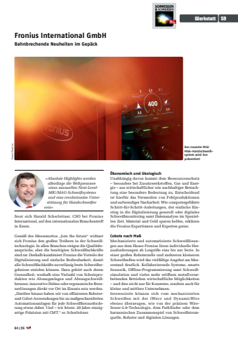 Werkstatt5904|25Fronius International GmbHBahnbrechende Neuheiten im Gep%u00e4ckDas neueste MIG/MAG-Handschwei%u00dfsystem wird live Fotos: Froniuspr%u00e4sentiert%u00bbAbsolute Highlights werden allerdings die Weltpremiere eines manuellen Next-LevelMIG/MAG-Schwei%u00dfsystems und eine revolution%u00e4re Unterst%u00fctzung f%u00fcr Handschwei%u00dfer sein%u00abfreut sich Harald Scherleitner, CSO bei Fronius International, auf den internationalen Branchentreff in Essen.Gem%u00e4%u00df des Messemottos %u201eJoin the future%u201c widmet sich Fronius den gro%u00dfen Treibern in der Schwei%u00dftechnologie. In allen Branchen steigen die Qualit%u00e4tsanspr%u00fcche, aber die ben%u00f6tigten Schwei%u00dffachkr%u00e4fte sind rar. Deshalb kombiniert Fronius die Vorteile der Digitalisierung und einfache Bedienbarkeit, damit alle Schwei%u00dffachkr%u00e4fte zuverl%u00e4ssig beste Schwei%u00dfergebnisse erzielen k%u00f6nnen. Dazu geh%u00f6rt auch deren Gesundheit, weshalb eine Vielzahl von Schutzprodukten wie Absauganlagen und Absaugschwei%u00dfbrenner, innovative Helme oder ergonomische Brennerl%u00f6sungen direkt vor Ort im Einsatz sein werden. %u201eDar%u00fcber hinaus haben wir von effizienten Roboterund Cobot-Anwendungen bis zu ma%u00dfgeschneiderten Automationsanlagen f%u00fcr jede Schwei%u00dfherausforderung etwas dabei. Und %u2013 wir feiern: 20 Jahre einzigartige Pr%u00e4zision mit CMT,%u201c so Scherleitner.%u00d6konomisch und %u00f6kologischUnabh%u00e4ngig davon kommt dem Ressourcenschutz %u2013 besonders bei Zusatzwerkstoffen, Gas und Energie %u2013 aus wirtschaftlicher wie nachhaltiger Betrachtung eine besondere Bedeutung zu. Entscheidend ist hierf%u00fcr das Vermeiden von Fehlproduktionen und aufwendiger Nacharbeit. Wie computergef%u00fchrte Schritt-f%u00fcr-Schritt-Anleitungen, der einfache Einstieg in die Digitalisierung generell oder digitales Schwei%u00dfmonitoring samt Datenanalyse im Speziellen Zeit, Material und Geld sparen helfen, erkl%u00e4ren die Fronius Expertinnen und Experten gerne.Cobots nach Ma%u00dfMechanisierte und automatisierte Schwei%u00dfl%u00f6sungen aus dem Hause Fronius l%u00f6sen individuelle Herausforderungen ab Losgr%u00f6%u00dfe eins bis zur Serie. In einer gro%u00dfen Roboterzelle und mehreren kleineren Schwei%u00dfzellen wird das vielf%u00e4ltige Angebot am Messestand deutlich. Kollaborierende Systeme, smarte Sensorik, Offline-Programmierung samt Schwei%u00dfsimulation und vieles mehr er%u00f6ffnen metallverarbeitenden Betrieben wirtschaftliche M%u00f6glichkeiten %u2013 und dies nicht nur f%u00fcr Konzerne, sondern auch f%u00fcr kleine und mittlere Unternehmen. Interessierte k%u00f6nnen sich vom mechanisierten Schwei%u00dfen mit der iWave und DynamicWire ebenso %u00fcberzeugen, wie von der pr%u00e4zisen WireSense-2.0-Technologie, dem Pathfinder oder dem harmonischen Zusammenspiel von Schwei%u00dfstromquelle, Roboter und digitalen L%u00f6sungen.